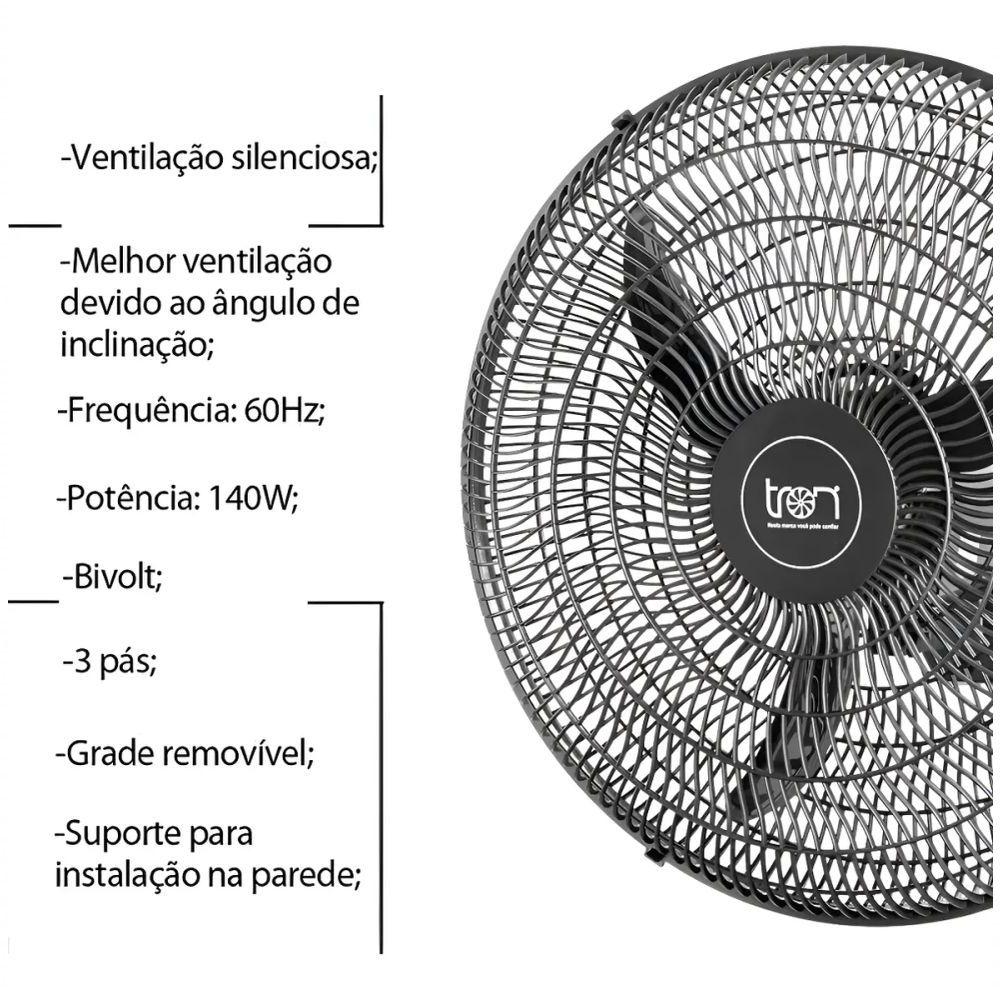 Vent Oscilante Parede Biv 60cm Pp At Preto 140wOs Ventiladores da Tron esbanjam inovação, beleza e versatilidade. Produtos que possuem boa ventilação, suprem a necessidade de quaisquer ambientes, flexíveis em posicionamento e colocação. O Ventilador da Linha PP possui grade em polipropileno de 60cm e é uma ótima opção para refrescar ambientes.TronDiâmetro: 60 cmFrequência: 60HzOscilação horizontal: SimPotência: 140 WVoltagem: BivoltInclinação Ajustável: SimCor: PretoTipo de ventilador: De paredeHélice: 3 PásGrade: SimVelocidades: 3Vazão: 3600m³/hRotação: 1200 RPMTipo: ParedeMarca: TronLargura: 62.0cmProfundidade: 16.0cmPeso: 4.54KgAltura: 80.5cm