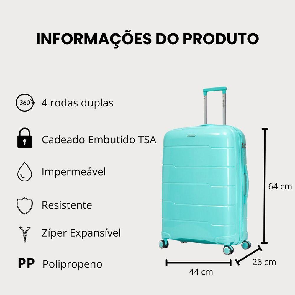 Mala Média 23kg Viagem Zíper Expansível Em Polipropileno Rodinhas 360º Tsa - Lima - Denlex Azul TurquesaMarca: DenlexModelo: LimaMaterial: Polipropileno inquebrável resistente à impactos e riscosTamanho: Mala de 23kgZíper expansível: Sim, expansível em 30% de capacidadeIndicação: Ideal para despachar em viagens de avião, ideal para viagens de carro, trem, ônibus e metrôCarrinho puxador: Embutido em alumínio antiferrugem com regulagens de alturaRodinhas: 4 rodas duplas com giro 360º para maior conforto no manuseioTipo de rodinhas: FixasCadeado: Embutido com segredo numérico de 3 dígitos para maior (Tsa)Alça: Superior e lateral para maior conforto ao carregarFecho: Zíper duplo para maior praticidade e Impermeável: SimOrganização interna: Divisória e cinta elástica fixadoraBolso interno: Contém bolso interno na divisória da malaForro interno: Completamente forrada com poliéster resistentePés de apoio laterais: SimPossui TSA: SimEspecificações da mala (Dentro do padrão de )Medidas com expansor fechado: 64cm x 44cm x 26cm - contando as rodas e alça (padrão )Medidas com expansor aberto: 64cm x 44cm x 30cm - contando as rodas e alça (padrão )Capacidade em volume: 67 litros / 77 litros com expansor abertoPeso: 3,5kgDiâmetro das rodinhas: 5 cmFabricada em polipropileno resistente, a mala garante durabilidade e proteção contra impactos.As rodinhas duplas 360º da mala proporcionam mobilidade suave e confortável, facilitando o deslocamento em qualquer superfície.O cadeado embutido Tsa oferece reforçada para seus pertences.A mala é ideal para quem busca leveza, organização e resistência em um só produto.Principais benefícios desse modelo: Capacidade para 23kg e divisória interna Material em polipropileno resistente e leve Rodinhas duplas giratórias 360º para máxima mobilidade Cadeado embutido Tsa para proteção dos seus itensPerguntas Frequentes – Mala de Viagem 23kg (Despachável)1. Essa mala é aceita como bagagem despachada nas companhias aéreas?Sim. A mala segue os padrões recomendados pelas companhias aéreas e é aceita como bagagem despachada na maioria das empresas nacionais e internacionais.2. Qual é o peso máximo permitido dentro da mala?O limite de peso depende de cada companhia aérea, mas geralmente as malas médias são aceitas com até 23kg para .3. Qual o material da mala?A mala é fabricada em polipropileno de alta resistência, um material leve, durável e que oferece excelente proteção contra impactos e arranhões durante o aéreo.4. A mala tem cadeado?Sim. Possui cadeado embutido com segredo numérico Tsa, garantindo para seus pertences durante toda a viagem.5. As rodinhas giram 360°?Sim. As rodinhas são multidirecionais 360°, proporcionando deslocamento suave e fácil em qualquer direção.6. A alça é resistente?Sim. Conta com alça telescópica em alumínio reforçado, além da alça superior e lateral fixa, oferecendo praticidade e conforto ao carregar.7. Qual a capacidade da mala em litros?A capacidade média é de aproximadamente 67 a 77 litros, ideal para viagens de vários dias.8. Essa mala risca fácil?Não. O polipropileno possui acabamento especial que ajuda a reduzir riscos e arranhões, mantendo a mala bonita mesmo após diversas viagens.9. Tem garantia?Sim. Todas as malas possuem garantia de , assegurando qualidade e tranquilidade ao cliente.10. Qual o prazo de ?O prazo de é de no máximo 1 dia útil, podendo ser enviado no mesmo dia da compra.11. A embalagem é resistente?Sim. Todas as malas são enviadas em caixas de papelão reforçadas, garantindo que sua mala chegue segura, protegida e em perfeito estado.