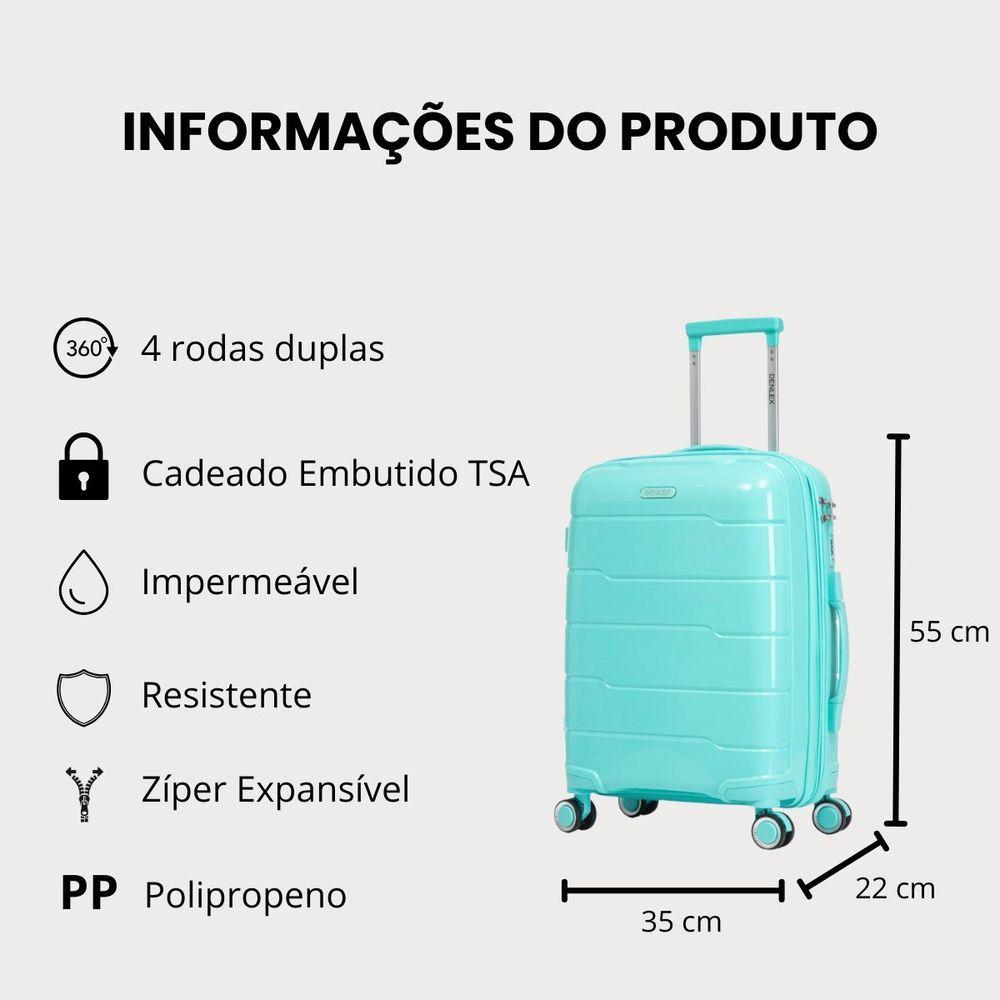 Mala De Bordo 10kg Viagem Zíper Expansível Em Polipropileno Rodinhas 360º Tsa - Lima - Denlex Azul TurquesaMarca: DenlexModelo: LimaMaterial: Polipropileno inquebrável resistente à impactos e riscosTamanho: Mala de 10kgZíper expansível: SimIndicação: Ideal para levar à bordo em viagens de avião, ideal para viagens de carro, trem, ônibus e metrôCarrinho puxador: Embutido em alumínio antiferrugem com regulagens de alturaRodinhas: 4 rodas duplas com giro 360º para maior conforto no manuseioTipo de rodinhas: FixasCadeado: Embutido com segredo numérico de 3 dígitos para maior (Tsa)Alça: Superior e lateral para maior conforto ao carregarFecho: Zíper duplo para maior praticidade e Impermeável: SimOrganização interna: Divisória e cinta elástica fixadoraBolso interno: Contém bolso interno na divisória da malaForro interno: Completamente forrada com poliéster resistentePés de apoio laterais: SimPossui TSA: SimEspecificações da mala (medidas dentro do padrão da ANAC)Medidas com expansor fechado: 55cm x 35cm x 22cm - contando as rodas e alça (padrão ANAC)Medidas com expansor aberto: 55cm x 35cm x 25cm - contando as rodas e alça (padrão ANAC)Capacidade em volume: 42 litros (expansor fechado) - 48 litros (expansor aberto)Peso: 2,5kgDiâmetro das rodinhas: 5 cmFabricada em polipropileno resistente, a mala garante durabilidade e proteção contra impactos.As rodinhas duplas 360º da mala proporcionam mobilidade suave e confortável, facilitando o deslocamento em qualquer superfície.O cadeado embutido TSA oferece reforçada para seus pertences.A mala é ideal para quem busca leveza, organização e resistência em um só produto.Principais benefícios desse modelo: Capacidade para 10kg e divisória interna Material em polipropileno resistente e leve Rodinhas duplas giratórias 360º para máxima mobilidade Cadeado embutido para proteção dos seus itens Perguntas Frequentes1. Essa mala é aceita como bagagem de mão nas companhias aéreas?Sim. A mala segue o padrão ANAC, sendo aceita como bagagem de mão em todas as companhias aéreas nacionais e internacionais.2. Qual é o peso máximo permitido dentro da mala?O limite de peso varia conforme a companhia aérea, mas geralmente é de até 10kg para bagagem de bordo.3. Qual o material da mala?As malas são feitas em polipropileno de alta resistência, materiais leves, duráveis e que oferecem proteção contra impactos e arranhões.4. A mala tem cadeado?Sim. Possui cadeado embutido com segredo numérico TSA, garantindo maior para sua bagagem.5. As rodinhas giram 360°?Sim. As rodinhas são multidirecionais 360°, o que facilita a movimentação em qualquer direção e garante praticidade no .6. A alça é resistente?Sim. Conta com alça telescópica em alumínio, além da alça fixa e lateral, garantindo conforto e resistência.7. Qual a capacidade da mala em litros?A capacidade é de 48L, ideal para viagens curtas ou de fim de semana.8. Essa mala risca fácil?Não. Os materiais utilizados possuem acabamento que ajuda a minimizar riscos e arranhões comuns durante viagens.9. Tem garantia?Sim. Todas as malas possuem garantia de , assegurando qualidade e tranquilidade para o cliente.10. Qual o prazo de ?O prazo de é de no máximo 1 dia útil, podendo ser no mesmo dia da compra.11. A embalagem é resistente?Sim. Todas as nossas malas são enviadas em caixas de papelão resistentes, assim sua mala será enviada e transportada com , evitando danos e chegando em perfeito estado.