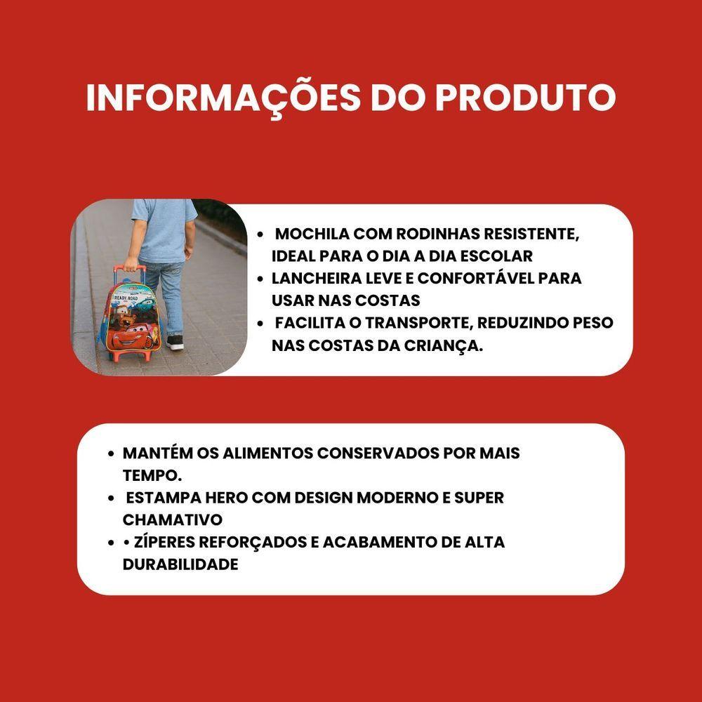 Mochila Escolar Meninos Carros Mc Queen Reforçada Com Rodinhas - Carros - Xeryus VermelhoMochila Escolar Infantil com Rodinhas Carros McQueen – Xeryus KidsPrepare seu filho para a com a mochila infantil com rodinhas da Xeryus Kids, inspirada no universo dos Carros McQueen. Ideal para meninos, esta mochila escolar reforçada oferece praticidade e conforto para o dia a dia.Características principais:- Design vibrante dos personagens McQueen, Mater e outros, que encantam as crianças- Puxador reforçado e resistente, ideal para puxar sem esforço- Rodinhas duráveis que facilitam o deslocamento em qualquer superfície- Compartimento espaçoso para livros, cadernos e materiais escolares- Bolsos laterais em tela para garrafa ou lanches- Material resistente que garante durabilidade mesmo com uso intensoPerfeita para tornar os passeios e dias na mais divertidos, esta mochila combina qualidade, conforto e o universo lúdico dos Carros McQueen. Garanta já a companhia ideal para as aventuras escolares do seu filho!Ficha Técnica: Marca: Xeryus Kids Material: Poliéster Garantia: 03 meses Altura: 46 cm Largura: 29 cm Profundidade: 14 cm Capacidade em volume: 21 litros Peso líquido: 1,5kg Rodinhas: Sim Compartimentos: 1 compartimento Bolsos laterais para garrafinhas e sombrinhas: Sim (2)Informações da Mochila: 1 Bolso Principal e 2 Laterais para garrafinhas Estampa Personalizada Mc Queen.Dúvidas FrequentesQual o prazo de ?Nosso prazo de é de no máximo 1 dia útil, podendo ser até no mesmo dia da confirmação da compra, dependendo do horário.Como o produto vem embalado?Nossos produtos são embalados com embalagens resistentes para que cheguem até você em perfeito estado.O produto possui garantia?Sim, todos os nossos produtos são e possuem garantia de fabricação de no mínimo 90 dias, conforme previsto no código de defesa do consumidor.