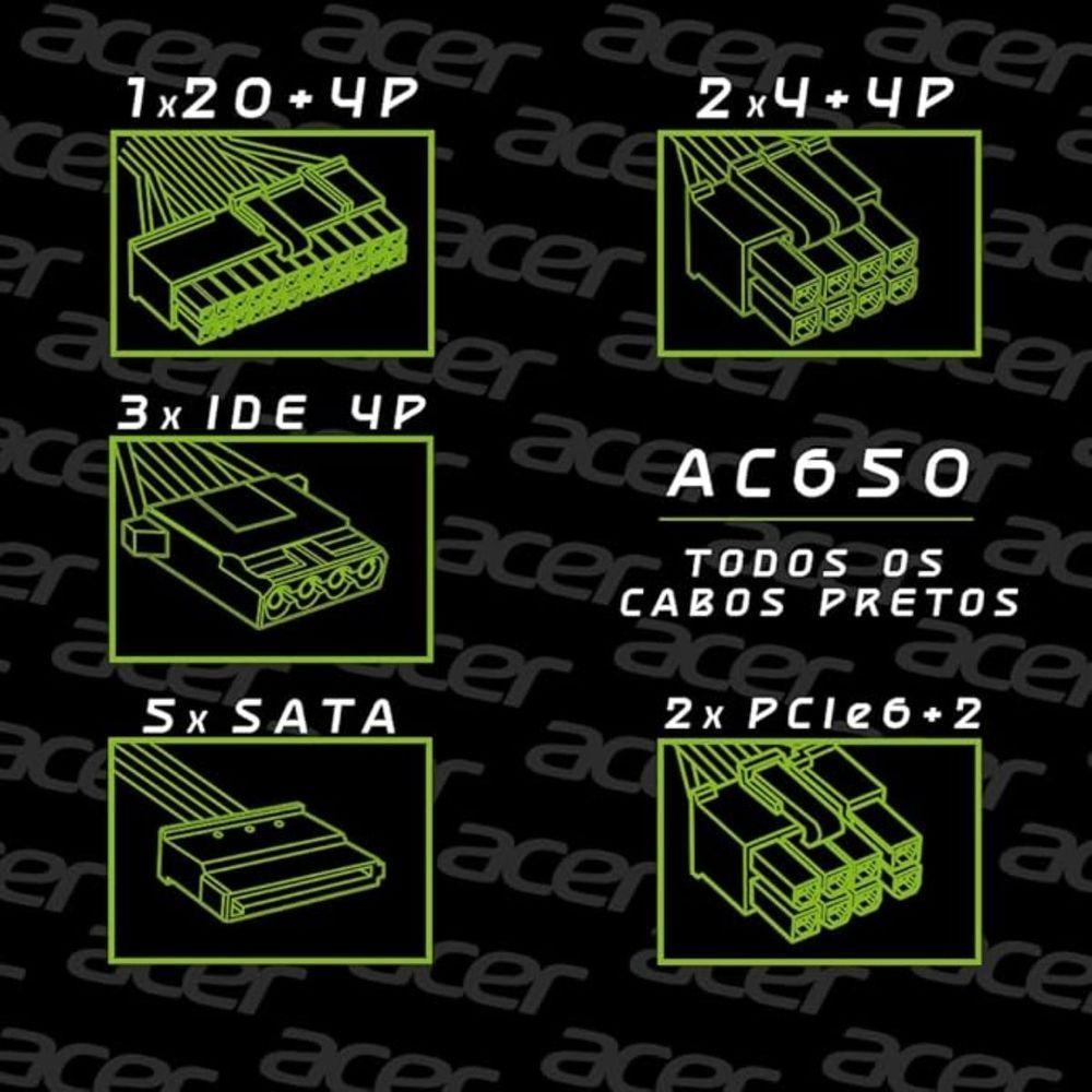Fonte Atx 650w Real Acer Ac650 80 Plus Bronze ModularDESCRIÇÃO GERAL:A Fonte ATX Acer AC650 650W Real oferece desempenho e eficiência para quem busca qualidade e estabilidade no fornecimento de energia. Com certificação 80 Plus Bronze, garante maior eficiência energética, reduzindo o desperdício de eletricidade. Seu design modular proporciona praticidade na organização dos cabos, permitindo um fluxo de ar otimizado dentro do gabinete. Além disso, sua potência real de 650W assegura um funcionamento confiável para sistemas exigentes.CARACTERÍSTICAS:Marca: ACERModelo: AC650Potência Real: 650WCertificação 80 Plus Bronze: SimPFC Ativo: SimFull Modular: SimFormato: ATXRefrigeração Fan: 120 mmRecursos de segurança: OVP, SCP, UVP, OPPFunção de proteção: Proteção contra sobretensão, curto-circuito, subtensão, sobrecargaConectores:1 x 20+4P2 x 4+4P3 x IDE5 x SATA2 x PCIE 6+2PESPECIFICAÇÕES TÉCNICAS:- Componentes eletrônicos com melhor condutividade e soldagem- Garante a saída total do circuito de 12V- Circuito de fibra de vidro de camada dupla- Indutor de filtro de cobre plano- Filtragem mais pura e anti-interferência- Precisamente integrada, estável e confiável- Resistência ao calor com cooler silencioso- Possui Interruptor ON/OFF