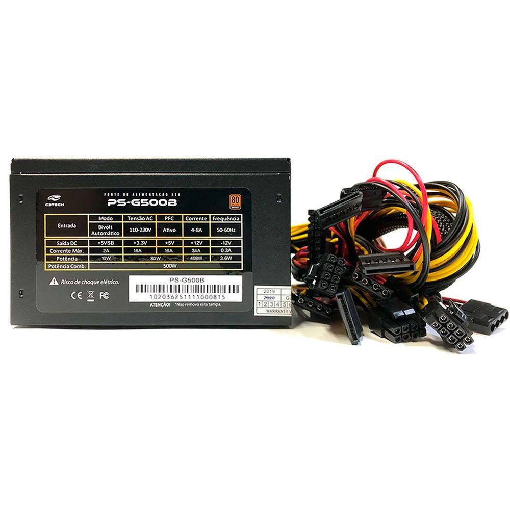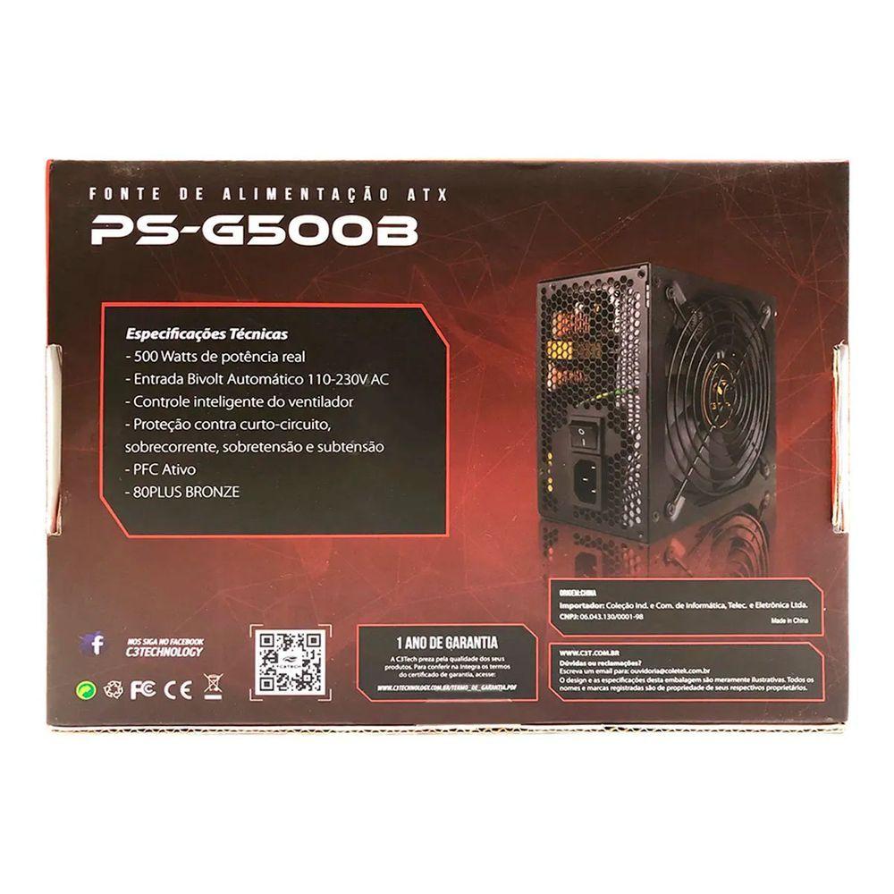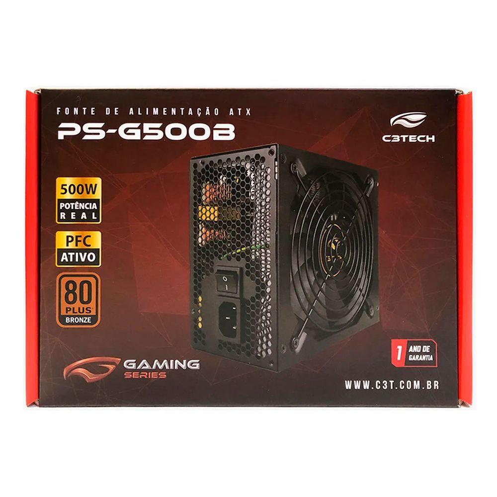 Fonte Atx C3tech Ps-g500b 500w 80 Plus Bronze PfcDESCRIÇÃO GERAL:A fonte de alimentação PS-G500B da C3Tech é a escolha ideal para quem busca qualidade e eficiência em seu . Com 500 Watts de potência real e certificação 80 Plus Bronze, ela oferece uma de energia eficiente e sem desperdícios, garantindo um funcionamento e refrigerado. Uma opção robusta que combina e desempenho, perfeita para configurações Intel e AMD.CARACTERÍSTICAS:MARCA: C3TECHMODELO: ;PS-G500BVOLTAGEM: BIVOLT AUTOMÁTICO (115/230V)ESPECIFICAÇÕES TÉCNICAS:Potência Real: 500WCertificação: 80 Plus BronzeProteções:Curto-circuito (SCP)Subtensão (UVP)Sobrecarga de tensão (OVP)Sobrecarga de corrente (OCP)Ventilador: 120mm de alta qualidadeMTBF: horas a 25°CAlimentação:Tensão AC: 115/230VCorrente de Entrada: 4-8AFrequência: 50/60 HzPFC: AtivoFator de Correção: 0,9PFEficiência Mínima: 80%Saídas:3,3V: 15A5V: 15A12V: 30A-12V: 0,3A5VSB: 2,5AConectores:1x Conector para Placa-Mãe: ATX20+4 Pinos1x Conector ATX Aux 12V (P4) 4+4 Pinos4x Conectores IDE4x Conectores SATA2x Conectores PCI Express 6+2P para Placa de VídeoCertificações:ATX EPS 80+ BronzeFCCTUVCERoHSINFORMAÇÕES ADICIONAIS:*: Não acompanha cabo de energia.Conteúdo da Embalagem:1x Fonte C3Tech PS-G500BManual de Instruções