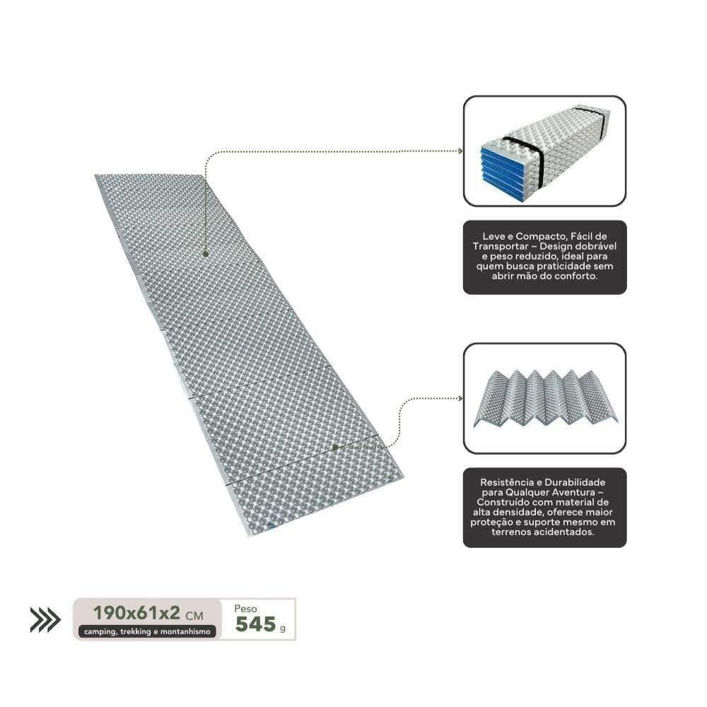 Esteira De Acampamento Dobrável Isolante Térmico 185x56x2 Cm ZeltEsteira de Acampamento Dobrável Isolante Térmico 185 × 56 × 2 cm — ZELTA Esteira de Acampamento Dobrável ZELT é um item indispensável para quem busca conforto, praticidade e proteção térmica em aventuras ao ar livre. Produzida em XPE (polietileno de célula fechada), garante excelente isolamento contra o frio do solo, tornando suas noites de camping muito mais aconchegantes e seguras.O grande diferencial está em sua face aluminizada, que reflete o calor do corpo e aumenta a eficiência do isolamento térmico. Isso proporciona maior retenção de calor, mantendo a temperatura estável mesmo em ambientes mais frios. Além disso, o formato casca de ovo otimiza o conforto, distribuindo melhor o peso e criando uma camada extra de retenção de calor.Extremamente leve, a esteira pesa apenas 360 g, o que facilita o transporte em mochilas de trekking ou expedições. Sua estrutura dobrável e a fita compactadora inclusa permitem que seja facilmente armazenada e transportada sem ocupar espaço excessivo, sendo perfeita para campistas que valorizam mobilidade e praticidade.Com dimensões de 185 × 56 × 2 cm, oferece espaço suficiente para um adulto de maneira confortável, garantindo apoio adequado ao corpo durante o descanso. Compacta, portátil e altamente funcional, a Esteira ZELT é ideal para uso em barracas, gramados, montanhas e até em situações emergenciais. Características técnicas Material: polietileno XPE (célula fechada) Dimensões: 185 × 56 × 2 cm Peso: 360 g Face aluminizada: sim Valor R (isolamento térmico): 2,0 Formato: dobrável com design casca de ovo Departamento: adulto unissex Acessório incluso: fita compactadora para transporte Marca: ZELT Garantia: 3 meses Benefícios Isolamento térmico superior: face aluminizada que reflete o calor corporal. Conforto aprimorado: formato casca de ovo distribui melhor o peso e retém calor. Leveza extrema: apenas 360 g, ideal para trekking e campings longos. Portabilidade: design dobrável com fita compactadora para transporte fácil. Durabilidade: material XPE de célula fechada resistente ao uso contínuo. Versatilidade: pode ser usada em barracas, gramados, montanhas ou situações emergenciais. Espaço ideal: dimensões que acomodam confortavelmente 1 adulto. Praticidade: abre e dobra rapidamente, ocupando pouco espaço na mochila.Garanta noites mais confortáveis e seguras em suas aventuras com a Esteira de Acampamento Dobrável Isolante Térmico ZELT — leve, compacta e eficiente, feita para quem busca desempenho em qualquer ambiente outdoor.* Imagens meramente ilustrativas. NA