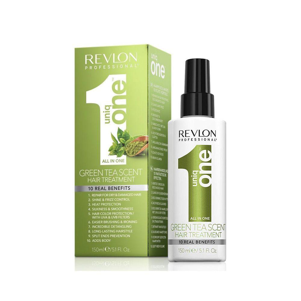 Revlon Professional Uniq One Green Tea Scent Hair Treatment 150mlRevlon Professional Uniq One Green Tea Scent Hair Treatment 150mlRevlon Uniq One All in One Green Tea - Leave In é uma máscara sem enxague que proporciona cabelos sublimes, protegidos e brilhantes com saúde.Especificações do Produto:1- Repara o cabelo seco e danificado2- Brilho e controlo do encrespado3- Proteção térmica4- Suavidade e sedosidade5- Proteção da cor/ Com filtros UVA e UVB6- Facilita o brushing7- E o uso da prancha surpreendente efeito desembaraçante8- Mantém o penteado por mais tempo9- Proporciona corpo e volume.Modo de uso:Vaporizar sobre o cabelo úmido.Não enxaguar.Precauções:Manter fora do alcance de crianças. Evitar contato com os olhos. Em caso de contato com os olhos lavar com água em abundância. Em caso de irritação, suspenda o uso e procure orientação médica.