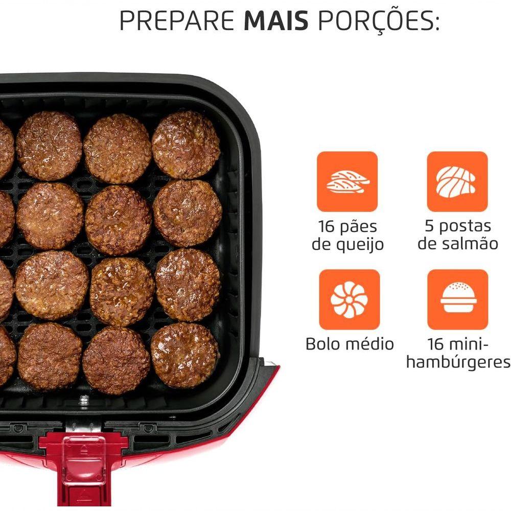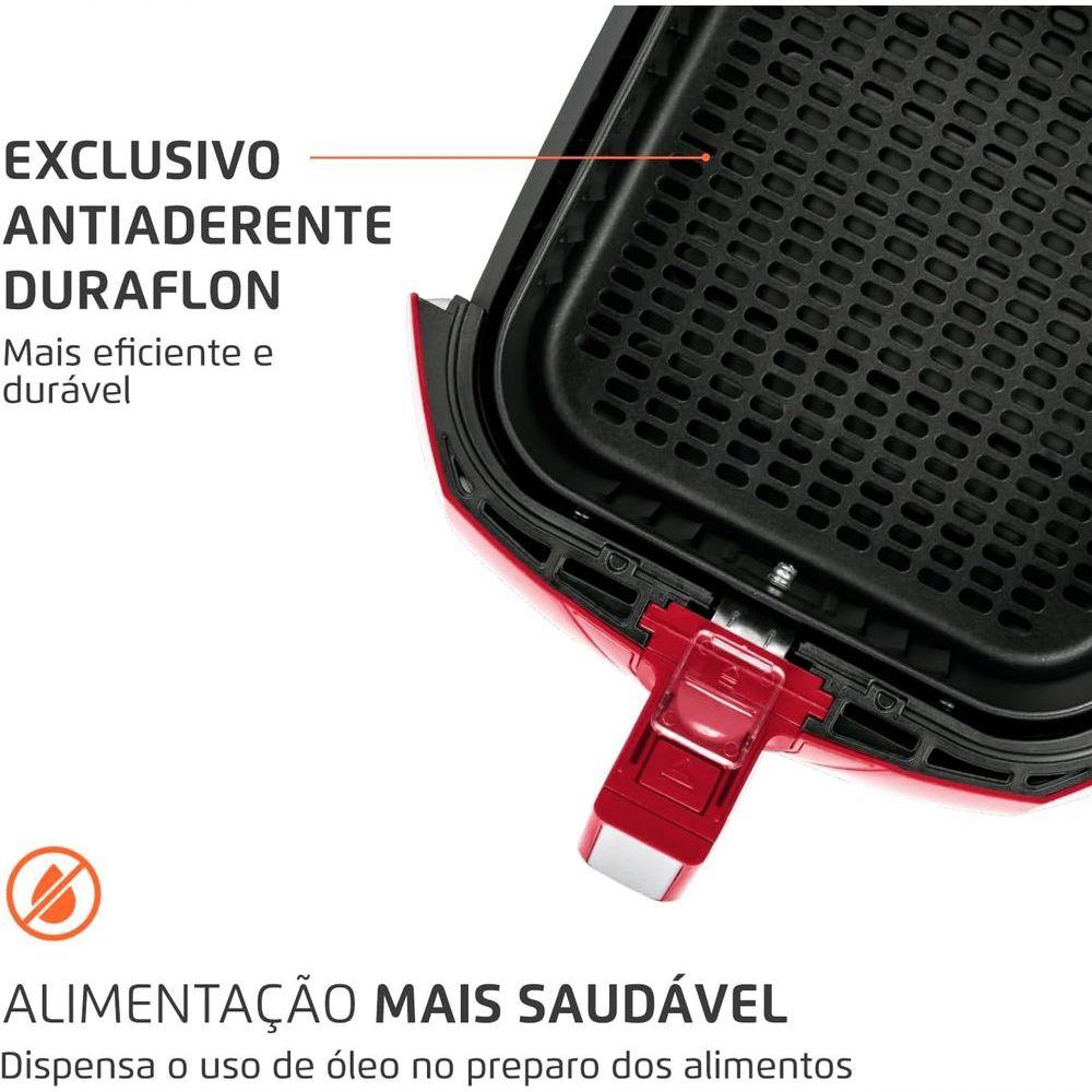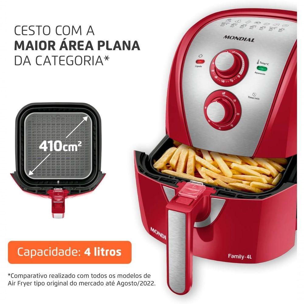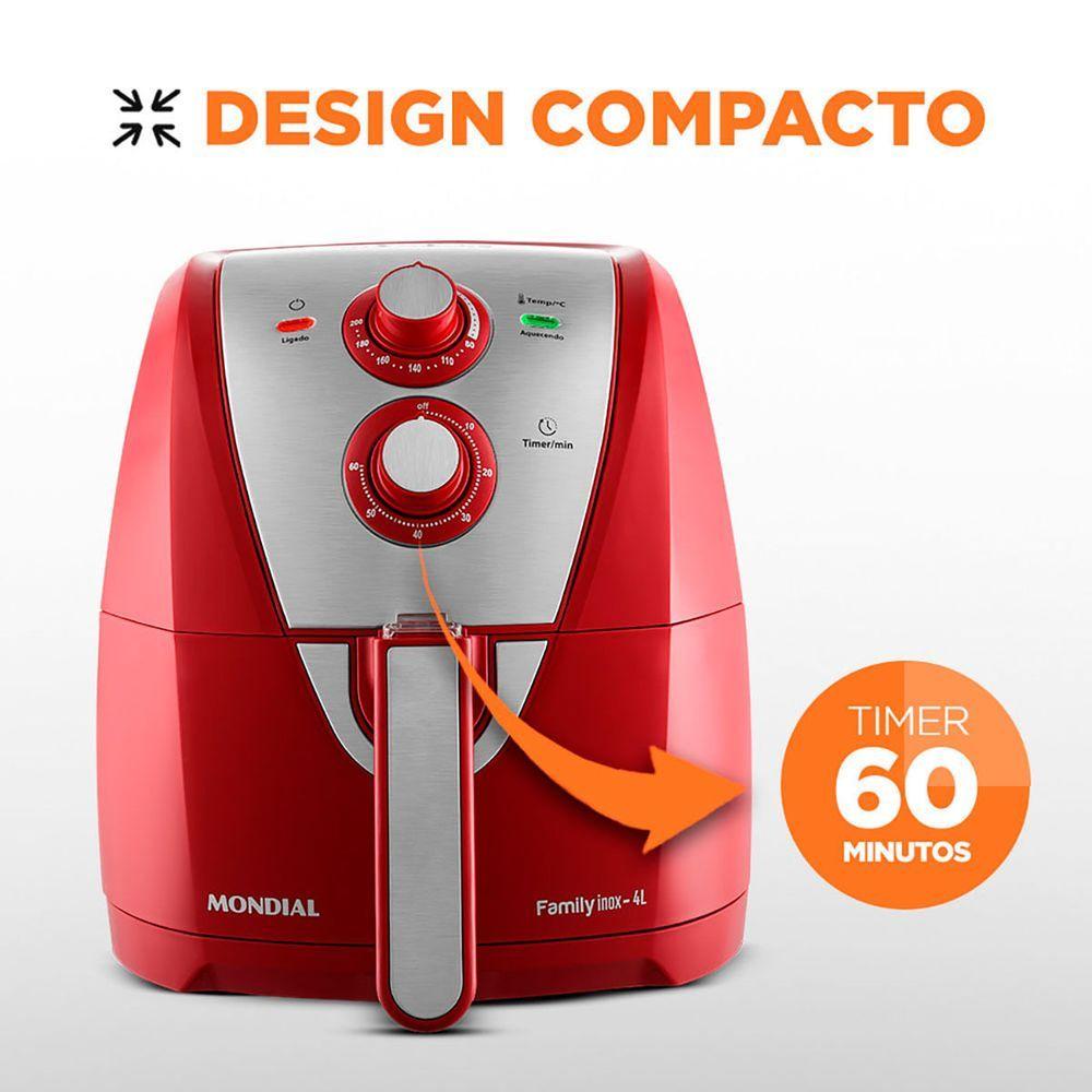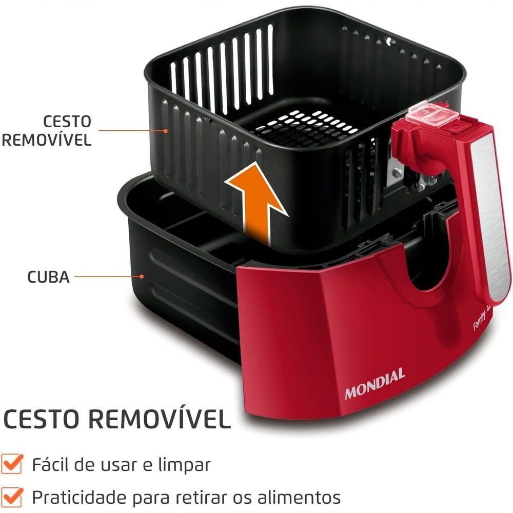 Fritadeira Sem Óleo Air Fryer 4L Mondial 1500W AFN-40-RI 220VPrepare receitas do café da manhã ao jantar com a Air Fryer Mondial. E o melhor: de forma prática, rápida e saudável. A tecnologia de circulação de ar quente cozinha, frita (a ar), assa ou tosta os alimentos sem precisar adicionar óleo ou manteiga. Aliada à alta potência, essa tecnologia também possibilita rapidez nos preparos. O cesto quadrado com capacidade de 4 litros acomoda melhor os alimentos, permitindo assar por igual. Saiba mais sobre a AFN-40-RI:Praticidade + rapidez na cozinha: a tecnologia de circulação de ar quente e a alta potência possibilitam rapidez no preparo das receitas e praticidade em sua rotina na cozinha.Capacidade de 4 litros + cesto quadrado: considerado o cesto com a maior área plana da categoria*, ele acomoda melhor os alimentos, permitindo assar e fritar por igual.Design compacto: a Air Fryer Mondial tem um design compacto e ocupa espaço reduzido na bancada da cozinha.Antiaderente: o cesto possui o antiaderente Duraflon, e os alimentos não grudam no fundo.Alimentação mais saudável: por não precisar de óleo ou manteiga no preparo das receitas, a Air Fryer permite uma rotina alimentar com mais sabor e saúde.Fácil de limpar: a limpeza da parte interna é fácil, pois a cuba e o cesto são removíveis e antiaderentes.Controle de temperatura até 200°C: permite a escolha da temperatura ideal para diferentes tipos de alimentos.Timer de 60 minutos: facilidade e comodidade de selecionar o tempo necessário de preparo das receitas.Aviso sonoro + desligamento automático: após o tempo predefinido no timer, há um aviso sonoro e a fritadeira desliga automaticamente.Muito além de batata frita: a Air Fryer é versátil e permite que você prepare pratos que vão muito além da clássica batata frita. É possível preparar legumes, carnes, peixes, lasanha, pizzas, além de pratos doces como pudim, bolo de chocolate e cookies. Use sua criatividade para fazer receitas deliciosas.Praticidade + rapidez na cozinha: a tecnologia de circulação de ar quente e a alta potência possibilitam rapidez no preparo das receitas e praticidade em sua rotina na cozinha.Capacidade de 4 litros + cesto quadrado: considerado o cesto com a maior área plana da categoria*, ele acomoda melhor os alimentos, permitindo assar e fritar por igual.Design compacto: a Air Fryer Mondial tem um design compacto e ocupa espaço reduzido na bancada da cozinha.Alimentação mais saudável: por não precisar de óleo ou manteiga no preparo das receitas, a Air Fryer permite uma rotina alimentar com mais sabor e saúde.Antiaderente: o cesto possui o antiaderente Duraflon, e os alimentos não grudam no fundo.Fácil de limpar: a limpeza da parte interna é fácil, pois a cuba e o cesto são removíveis e antiaderentes.