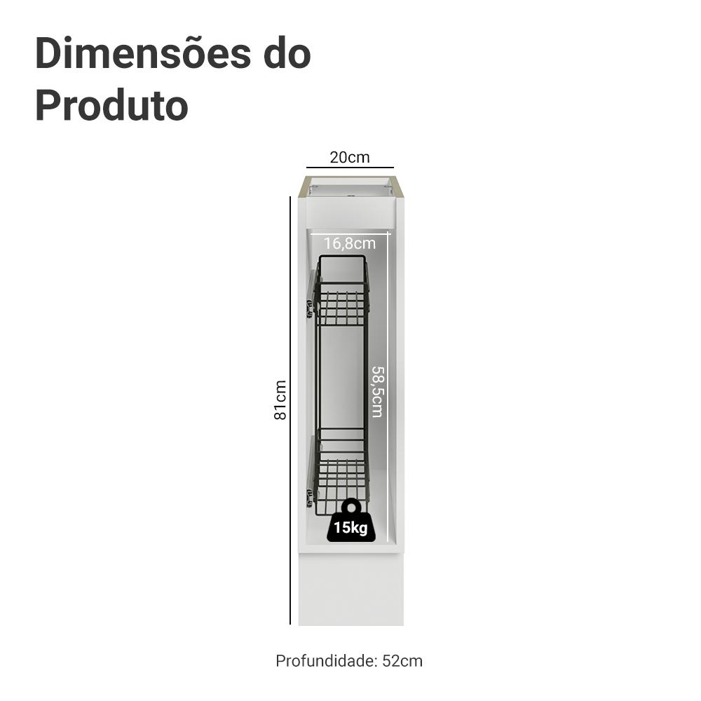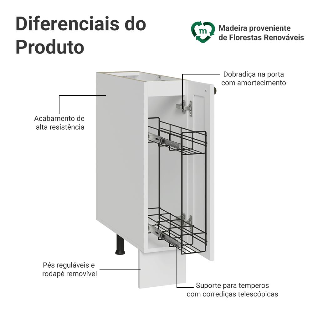 O Armário Porta-Temperos foi criado para facilitar sua rotina, e a versão com porta mantém os temperos sempre organizados e protegidos.O organizador metálico interno possui deslizamento suave com abertura total, facilitando o uso no dia a dia. As dobradiças com amortecimento garantem fechamento silencioso, enquanto os pés reguláveis e o rodapé removível tornam a limpeza mais simples.O acabamento possui uma textura suave ao toque. O puxador ponto em ouro envelhecido adiciona personalidade. Já o detalhe chanfrado das frentes cria molduras elegantes, remetendo ao estilo americano com um toque moderno.Importante: este balcão é vendido sem tampo.Medidas totais:- 81 cm de altura- 20 cm de largura- 52 cm de profundidadeInformações técnicas:- Material: MDP- Peso suportado: 15kg- Altura dos pés: reguláveis de 15cm a 20cmO que você recebe:- Um Armário Porta-Temperos com uma porta (Não acompanha tampo)Código do produto:XMG2420809VKSTXMG24208L8VKSTXMG24208F8VKSTXMG24208L9VKSTÉ importante saber:- Imagens meramente ilustrativas, a decoração não acompanha o produto- A Madesa não disponibiliza serviço de montagem- O produto segue com manual de instalação e todas as ferragens necessárias para sua montagemA Madesa possui compromisso com a sustentabilidade. Geramos energia limpa em nossa própria usina, priorizamos fornecedores responsáveis e utilizamos plástico reciclado em nossa produção. Além disso, reinserimos sobras no ciclo de reciclagem e investimos no desenvolvimento de nossos colaboradores e da comunidade.Garantia: Este produto conta com 1 ano de garantia total, sendo 3 meses de garantia legal e 9 meses de garantia contratual. A garantia cobre exclusivamente defeitos de fabricação e vícios ocultos. Não estão cobertos: problemas decorrentes de montagem incorreta, uso inadequado, exposição à umidade, calor ou luz solar direta, modificações no produto ou desgaste natural.