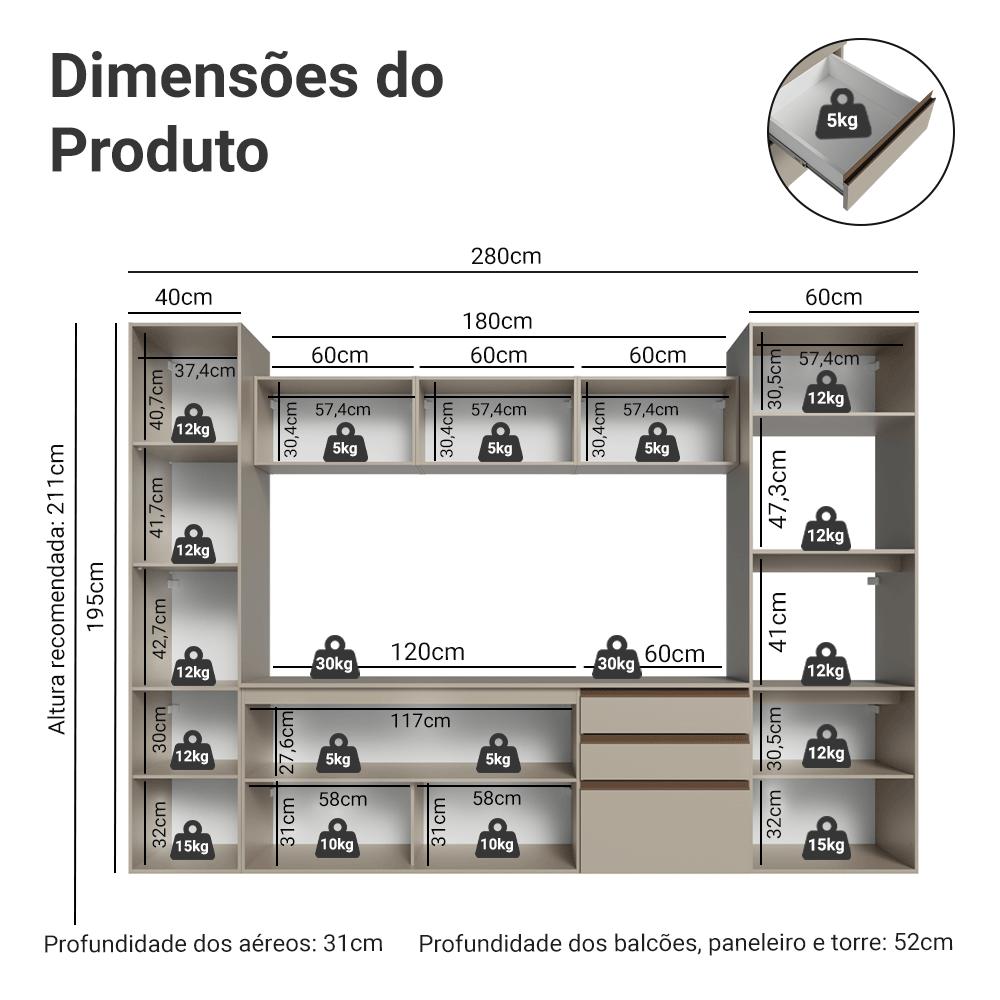 A Cozinha Completa Nice oferece praticidade, organização e um visual moderno.A linha Nice se diferencia por ser suspensa, acompanhando ferragens para fixação. Entre os destaques, estão a torre quente, o paneleiro com ótimo espaço interno e os armários aéreos com porta basculante. Possui corrediças que proporcionam abertura total das gavetas, e a porta basculante permanece suspensa durante o uso. Os balcões acompanham tampo, garantindo mais praticidade.Medidas totais:- 211 cm de altura- 280 cm de largura- 52 cm de profundidade nos balcões, torre quente, paneleiro e 31 cm nos aéreosInformações técnicas:- Material: MDP- Peso total suportado: 246 kgO que você recebe:- Uma Torre Quente de 60cm- Três aéreos de 60cm- Um Balcão de 120cm- Um Balcão de 60cm- Um Paneleiro de 40cmCódigo do produto:XMGRNC2800063BXMGRNC2800067PÉ importante saber:- Imagens meramente ilustrativas, a decoração não acompanha o produto- A Madesa não disponibiliza serviço de montagem- O produto segue com manual de instalação e todas as ferragens necessárias para sua montagemA Madesa possui compromisso com a sustentabilidade. Geramos energia limpa em nossa própria usina, priorizamos fornecedores responsáveis e utilizamos plástico reciclado em nossa produção. Além disso, reinserimos sobras no ciclo de reciclagem e investimos no desenvolvimento de nossos colaboradores e da comunidade.Garantia: Este produto conta com 1 ano de garantia total, sendo 3 meses de garantia legal e 9 meses de garantia contratual. A garantia cobre exclusivamente defeitos de fabricação e vícios ocultos. Não estão cobertos: problemas decorrentes de montagem incorreta, uso inadequado, exposição à umidade, calor ou luz solar direta, modificações no produto ou desgaste natural.