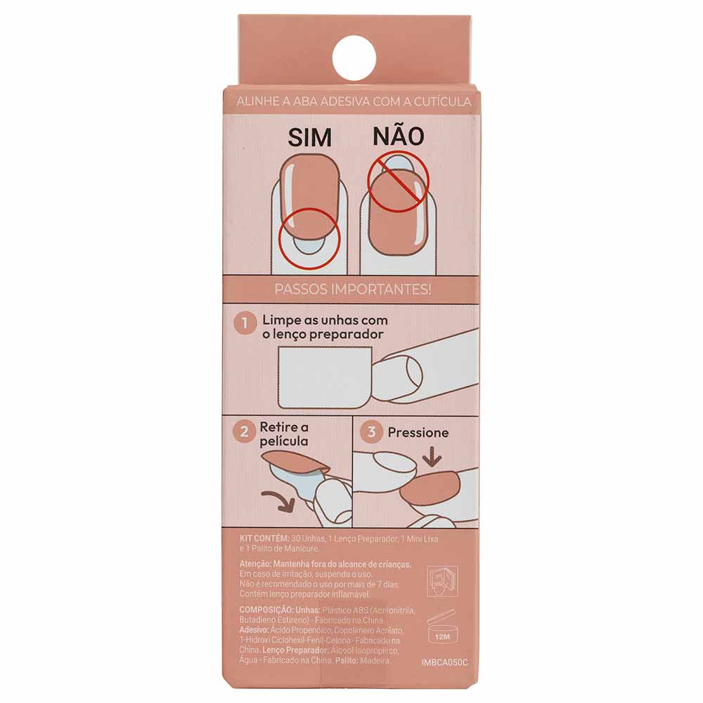 As unhas autocolantes possuem um adesivo sensível a pressão, quanto mais você pressionar, melhor a fixação podendo ter um resultado duradouro. Antes de iniciar a preparação, lixe o leito das unhas naturais para promover maior aderência à unha autocolante. Se desejar, lixe o comprimento e formato das unhas autocolantes após 1h da aplicação. Evite contato com água e demais líquidos antes de 1h de aplicação.