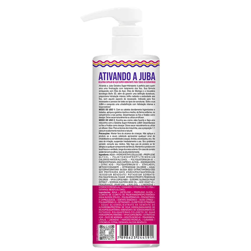A fórmula da Gelatina Super Hidratante é enriquecida com Óleo de Açaí e Óleo de Moringa, além da tecnologia Biofix 3D. Esses ativos combinam propriedades nutritivas que garantem hidratação, brilho e definição aos cabelos.