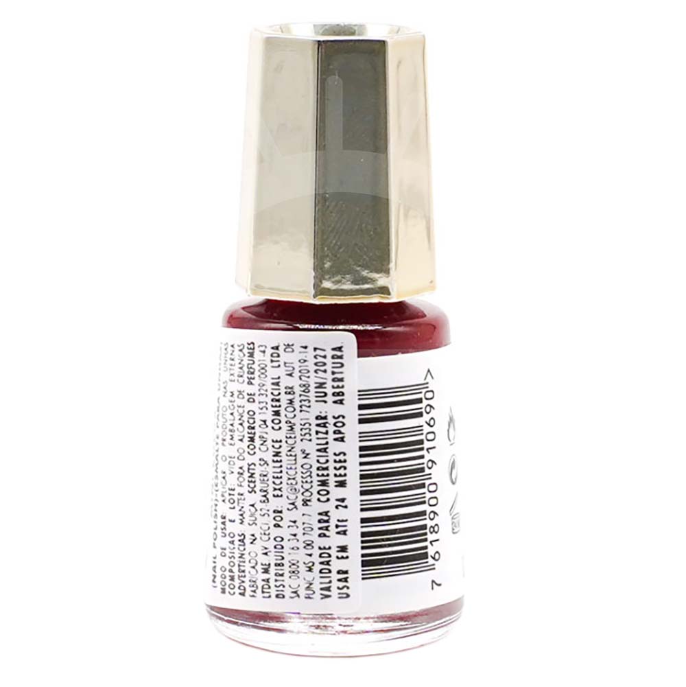 O MINI COLOR, com sua tampa dourada octogonal, é um produto MAVALA de estrela, inalterado desde 1962! Devido ao seu tamanho reduzido, seu conteúdo é utilizado sem desperdício. Seu pequeno frasco dura em média por uma estação, não dá tempo de se cansar da cor, como acontece com cores da moda! Permitindo comprar 2, 3 ou mais cores ao mesmo tempo. Principais Ingredientes: • Resinas formam a base do esmalte: da qual a nitrocelulose, é um produto natural extraído da madeira • Mistura inteligente de plastificantes para otimizar o brilho, durabilidade e secagem do esmalte. • Corantes e, em esmaltes perolados, madrepérola natural ou artificial, de acordo com os tons e efeitos escolhidos. • Solventes. Benefícios: • Sem Formaldeído • Sem Tolueno • Sem Ftalato • Sem Xileno • Sem adição de Colofanito • Sem ingredientes de origem animal • Sem metais pesados • Sem conservantes* Ativos: • Resinas formam a base do esmalte: da qual a nitrocelulose, é um produto natural extraído da madeira. • Mistura inteligente de plastificantes para otimizar o brilho, durabilidade e secagem do esmalte. • Corantes e, em esmaltes perolados, madrepérola natural ou artificial, de acordo com os tons e efeitos escolhidos. • Solventes. Modo de Usar: Após a base, aplicar 2 camadas do esmalte Mavala nas unhas.