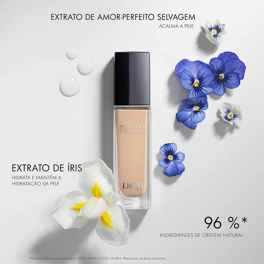 Dior Forever Skin Correct é o Corretivo de Olhos clean* de alta perfeição da Dior que oferece hidratação e durabilidade 24h**. Em uma única passagem, este corretivo multiuso de cobertura total com textura cremosa esconde olheiras, vermelhidão localizada e manchas para correção impecável e disfarce de olheiras, sem transferência. De manhã à noite, alisa e realça a pele, sem se fixar nas linhas do rosto. Ele resiste em todas as condições de calor e umidade. Composto por 96%*** de ingredientes de origem natural, este corretor para as olheiras é limpo, * formulado de acordo com uma rigorosa lista de ingredientes e infundido com extrato de íris, com propriedades hidratantes; extrato de amor-perfeito selvagem, que contribui para o conforto; e extrato de milefólio, que contribui para o ação iluminadora e suavizante na área dos olhos. 100% do material plástico usado na tampa Dior Forever Skin Correct é reciclado**** e seu frasco é feito de 15% de vidro reciclado, o que mostra o compromisso da Maison Dior com a beleza sustentável. Este corretivo não é comedogênico e é dermatologicamente testado. * Para mais informações, visite a página da Dior, “Carta de Formulação Responsável”. ** Duração: teste instrumental em 27 indivíduos. Hidratação: teste instrumental em 31 indivíduos. *** Valor calculado com base na norma ISO 16128-1 e ISO 16128-2. Porcentagem de água incluída. Os demais ingredientes contribuem para o desempenho, apelo sensorial e estabilidade da fórmula. **** Não considera corantes e aditivos adicionados. Percentual calculado com base no padrão GRS (Global Recycled Standard) – versão 4.0. Modo de usar: 1. Para abrir o olhar, aplique o corretivo Dior Forever Skin Correct na pálpebra móvel, abaixo do arco da sobrancelha e no canto externo do olho. 2. Para iluminar, aplique o corretivo nas áreas sombreadas do rosto: olheiras, cavidade do queixo e laterais do nariz. 3. Para contornar o rosto, aplique o corretivo na testa, no osso do nariz, na ponta do queixo e na parte superior das maçãs do rosto.