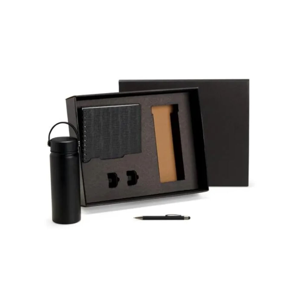 O conjunto apresenta design coeso na cor preta, dos itens à embalagem tipo caixa preta. A composição inclui inox para a garrafa, bambu para a caneta e papel de alta qualidade para o caderno, garantindo um produto robusto e funcional.