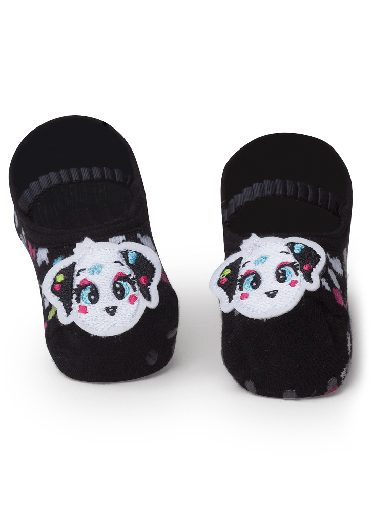 A meia com modelagem sapatilha é produzida em algodão macio, possui acabamentos em viés, elástico confortável e aplique divertido.