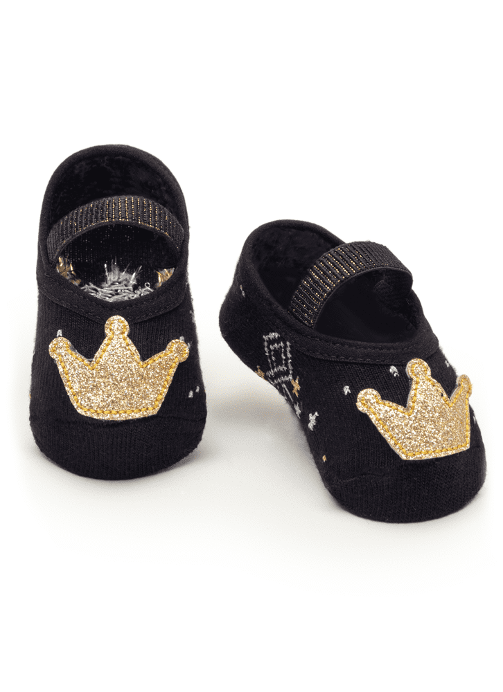 A meia com modelagem sapatilha com desenho em lurex prata, é produzida em algodão macio em sua maior parte e poliamida, possui acabamento em viés e elástico texturizado confortável com dourado e preto. Possui aplique de coroa dourada aplicado na frente da meia e antiderrapante no tamanho 9 á 12 meses, com aroma cheirinho de bebê. Instruções de Lavagem: LAVAGEM A MÃO; NÃO ALVEJAR Instruções de Conservação: NÃO SECAR EM TAMBOR; NÃO PASSAR; NÃO LIMPAR A SECO (MAIS INFORMAÇÕES, VIDE NA ETIQUETA) Instruções de Garantia: DEVERÁ SER ENCAMINHADO DENTRO DA EMBALAGEM ORIGINAL; SEM INDICAÇÕES DE USO; ACOMPANHADO DE NOTA FISCAL E COM TODOS OS ITENS CONSTANTE NA SOLICITAÇÃO DA COMPRA