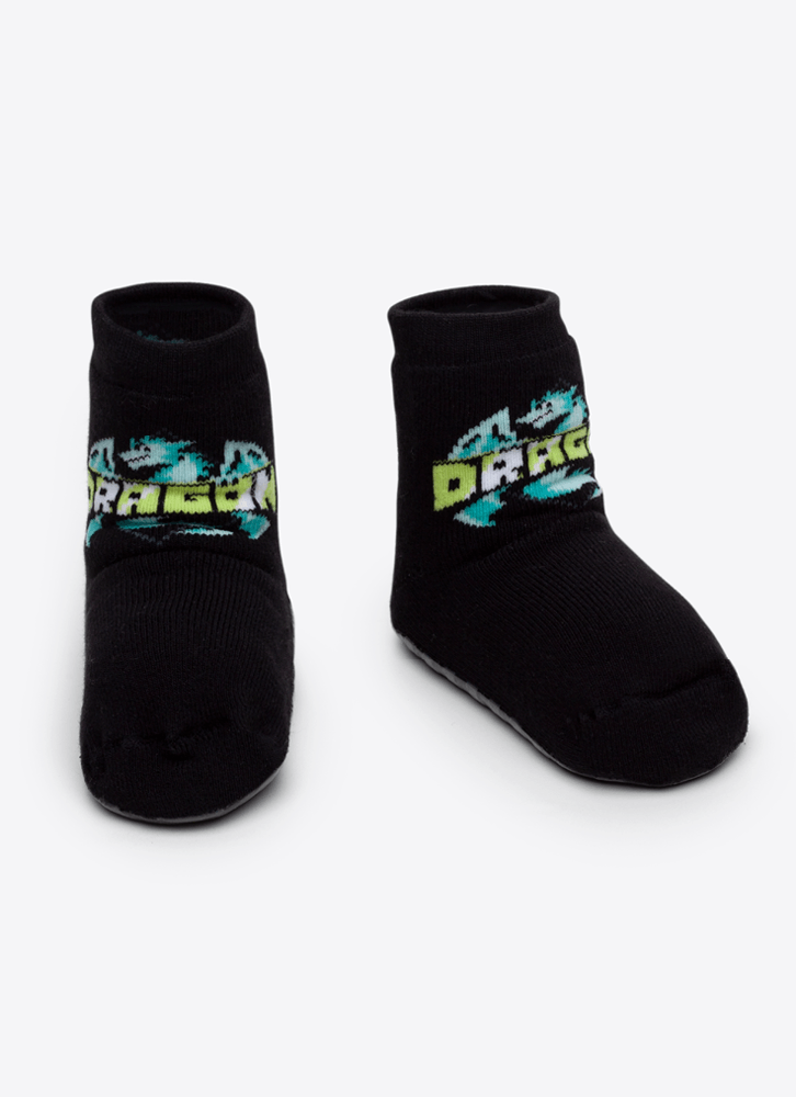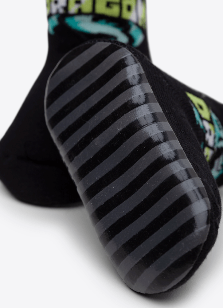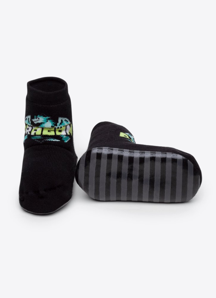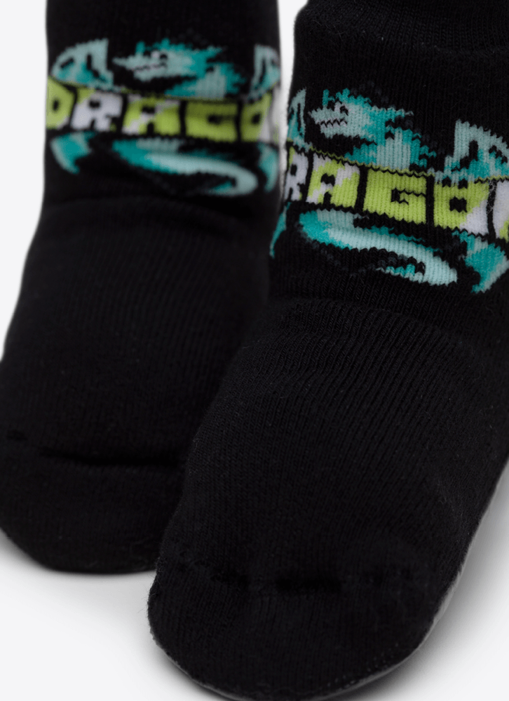 A meia pansocks soquete atoalhada com desenho de dragão , é produzida em algodão macio em sua maior parte e poliamida, possui cano de altura média.