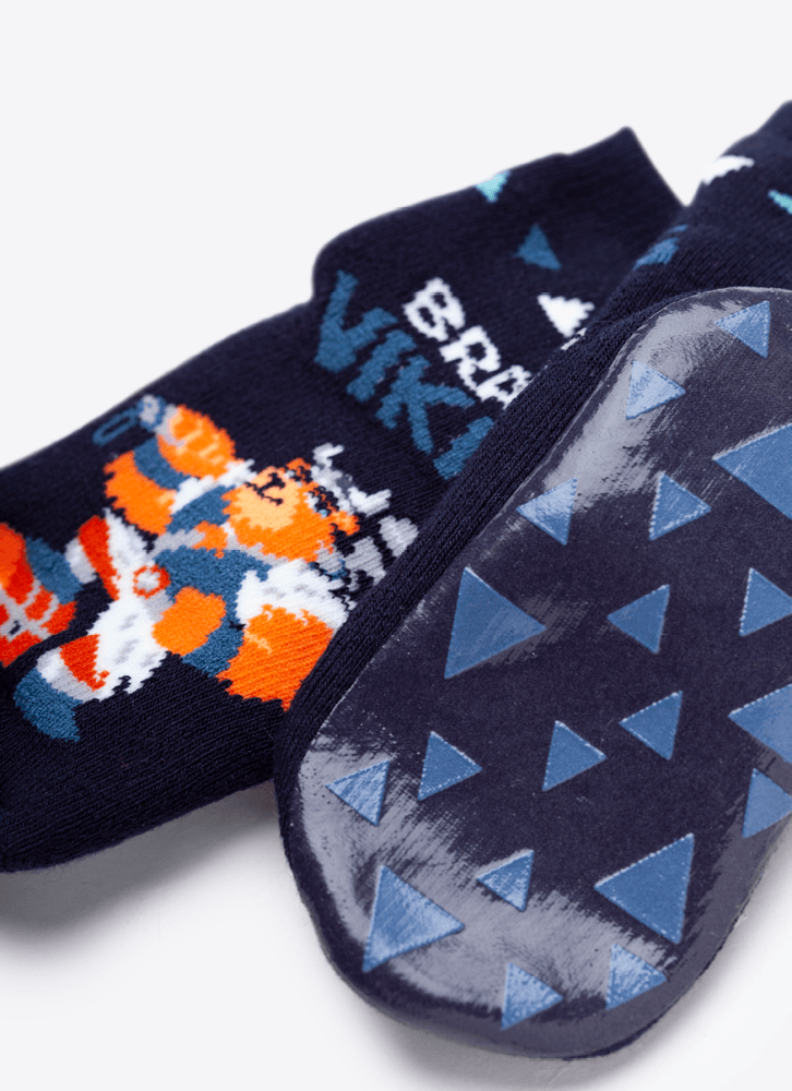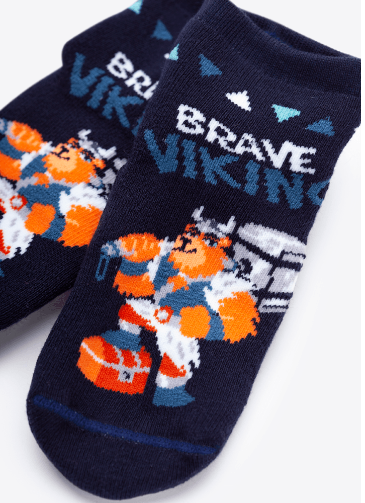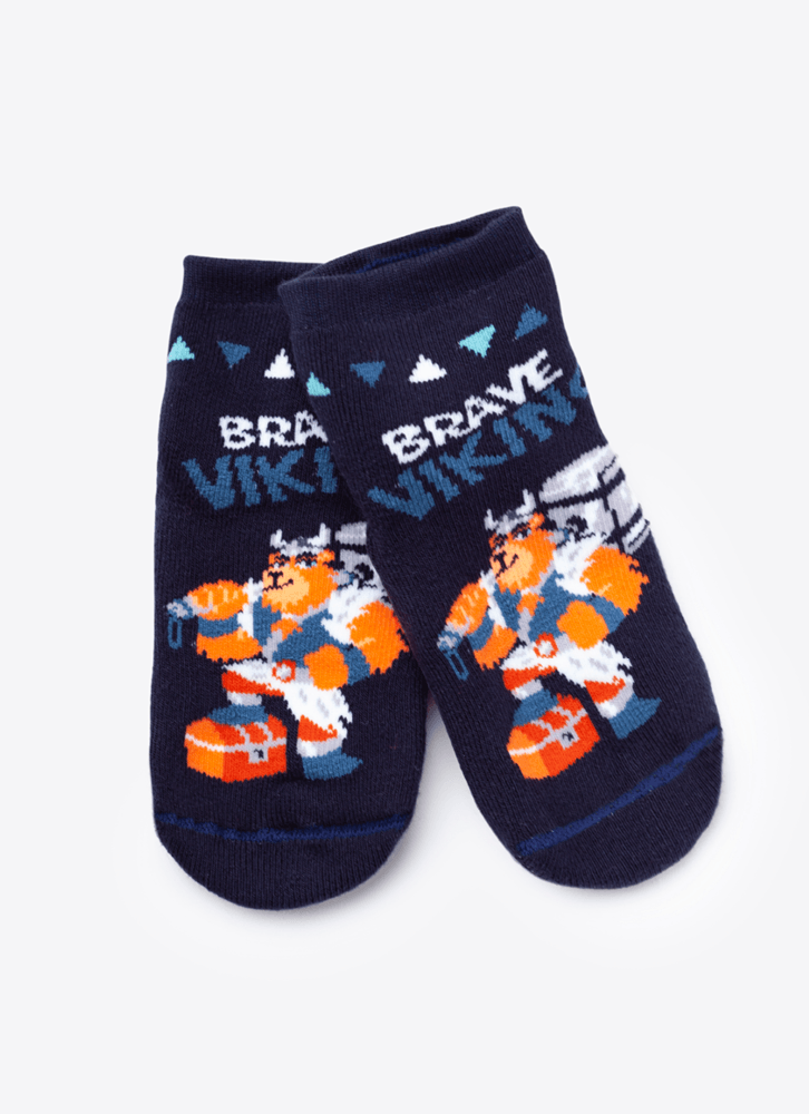 A meia pansocks soquete atoalhada com desenho de urso viking, é produzida em algodão macio em sua maior parte e poliamida, possui cano de altura média.