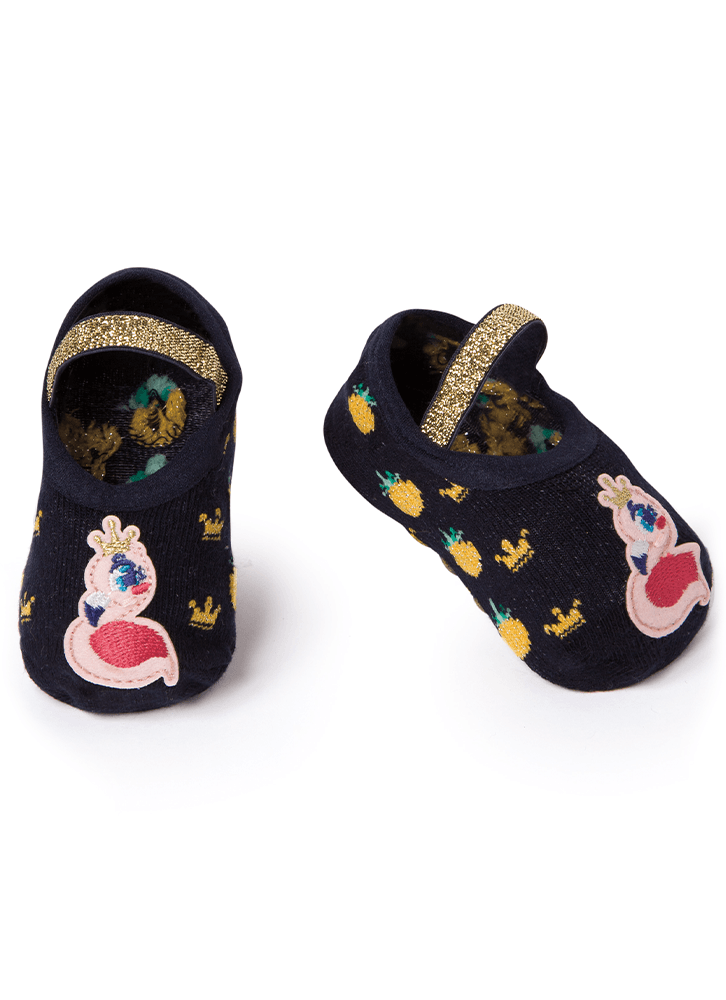 A meia com modelagem sapatilha é produzida em algodão macio, possui acabamentos em viés e aplique delicado de flamingo.
