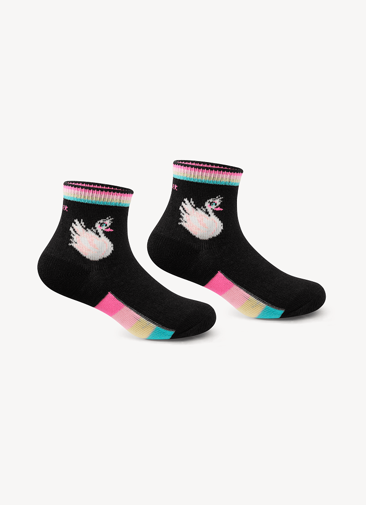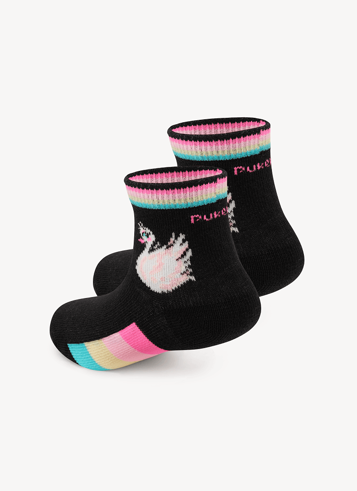 "A meia soquete com desenho divertido do cisne e o solado colorido , é produzida com algodão macio em sua maior parte e poliamida, possui cano de altura média.
