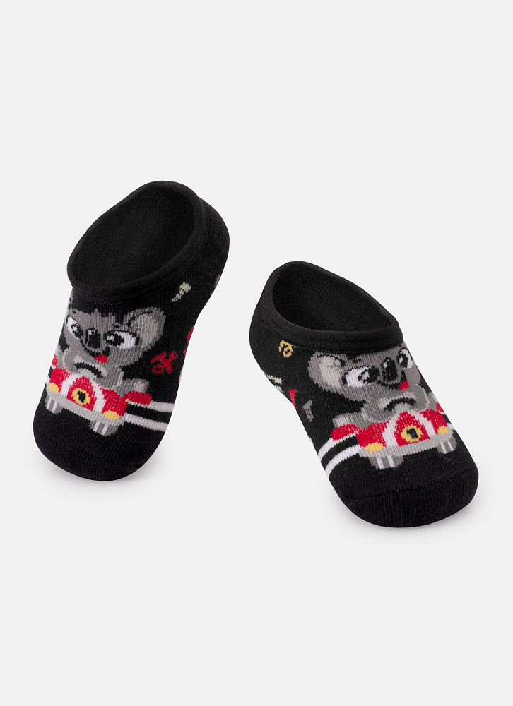 Meia com modelagem sapatinho com desenho divertido de coala, é produzida com algodão macio em sua maior parte e poliamida, possui acabamento em viés, antiderrapante com aroma e cheirinho de bebê.