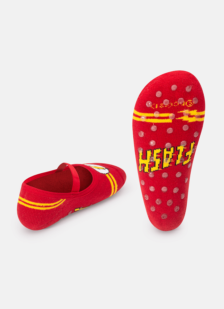 Meia com modelagem sapatilha atoalhada com desenho do Flash. Produzida com algodão macio em sua maior parte poliamida. Possui acabamento em viés e elástico confortável. Solado com antiderrapante sem aroma. Indicação de Lavagem: Lavagem a mão; não alvejar Instruções de Conservação: Não secar em tambor; não passar; não limpar a seco. Instruções de Garantia: Deverá ser encaminhado dentro na embalagem original. Acompanhado de Nota Fiscal. E com todos os itens constante na solicitação da compra.