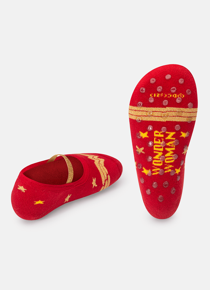 Meia com modelagem sapatilha atoalhada com desenho da Mulher maravilha. Produzida com algodão macio em sua maior parte poliamida, e detalhes com fio de lurex. Possui acabamento em viés e elástico confortável com detalhes em lurex. Solado com antiderrapante sem aroma. Indicação de uso: Ideal para praticar exercícios e brincadeiras sem o calçado e uso no dia a dia em casa. Lavagem a mão Não alvejar Instruções de Conservação: Não secar em tambor Não passar Não limpar a seco (MAIS INFORMAÇÕES, VIDE NA ETIQUETA) Instruções de Garantia: Deverá ser encaminhado dentro na embalagem original ACOMPANHADO DE NOTA FISCAL E com todos os itens constante na solicitação da compra.