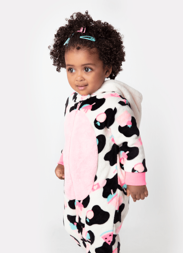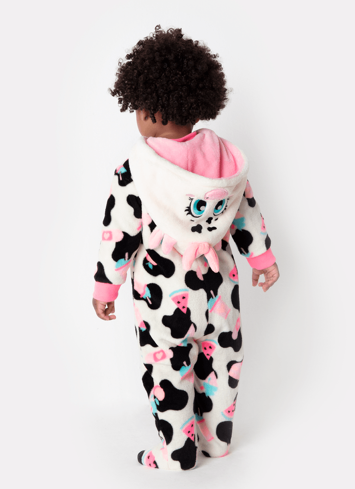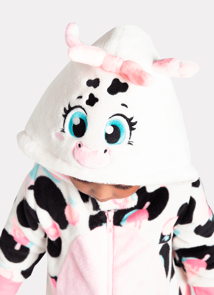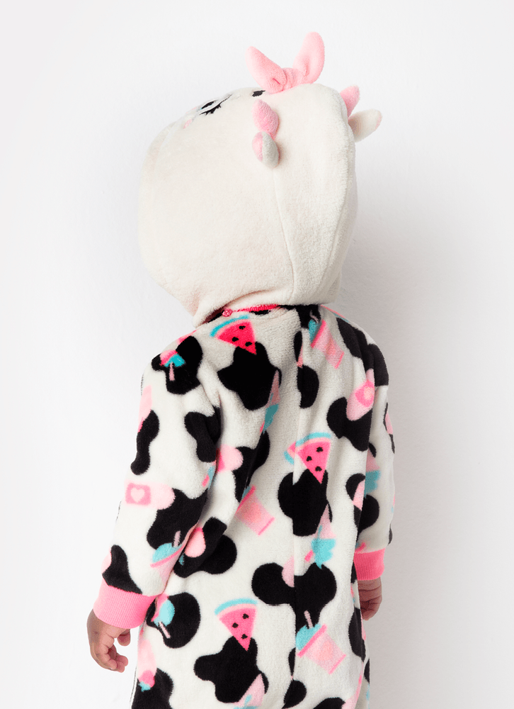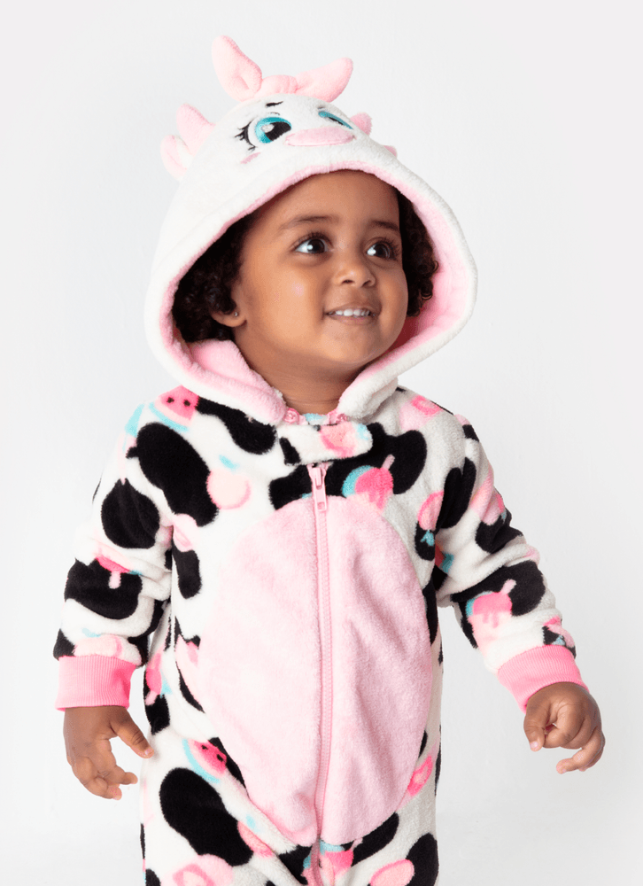 Macacão em coral fleece com estampa de vaquinha Puket <3 Possui toque macio devido a sua característica felpuda o que torna o pijama super quentinho e confortável. Ideal para aconchegar noites frias. - Macacão todo em estampa corrida no tema vaquinha e fecho frontal em zíper; - Capuz bordado e com aplique 3D do rostinho do personagem; - Fechamento nas pernas por botão de pressão para facilidade; - Zíper com acabamento de segurança interno; - Punhos da manga e barra em ribana. Lavagem e conservação: Lavagem à mão; não alvejar; não secar em tambor; não passar; não limpar a seco (para mais informações, consulte a etiqueta fixada ao produto). Garantia: Deverá ser encaminhado dentro da embalagem original; sem indicações de uso; acompanhado de nota fiscal e com todos os Itens constante na solicitação da compra.