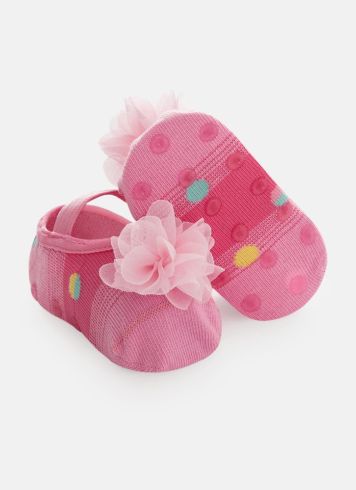 Meia sapatilha desenhada com aplique de flor, costurado e aplicado na frente da meia. Produzida com algodão macio e desenho em poliamida. Possui acabamento em viés e elástico confortável. Solado com antiderrapante no tamanho 9 á 12 meses com aroma cheirinho de bebê. Indicação de uso: Ideal para compor com a roupinha sem o uso do calçado e usar no dia a dia. Instruções de Lavagem: Lavagem a mão Não alvejar Instruções de Conservação: Não secar em tambor Não passar Não limpar a seco (MAIS INFORMAÇÕES, VIDE NA ETIQUETA) Instruções de Garantia: Deverá ser encaminhado dentro na embalagem original acompanhado de nota fiscal e com todos os itens constantes na solicitação da compra.