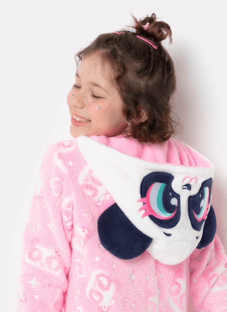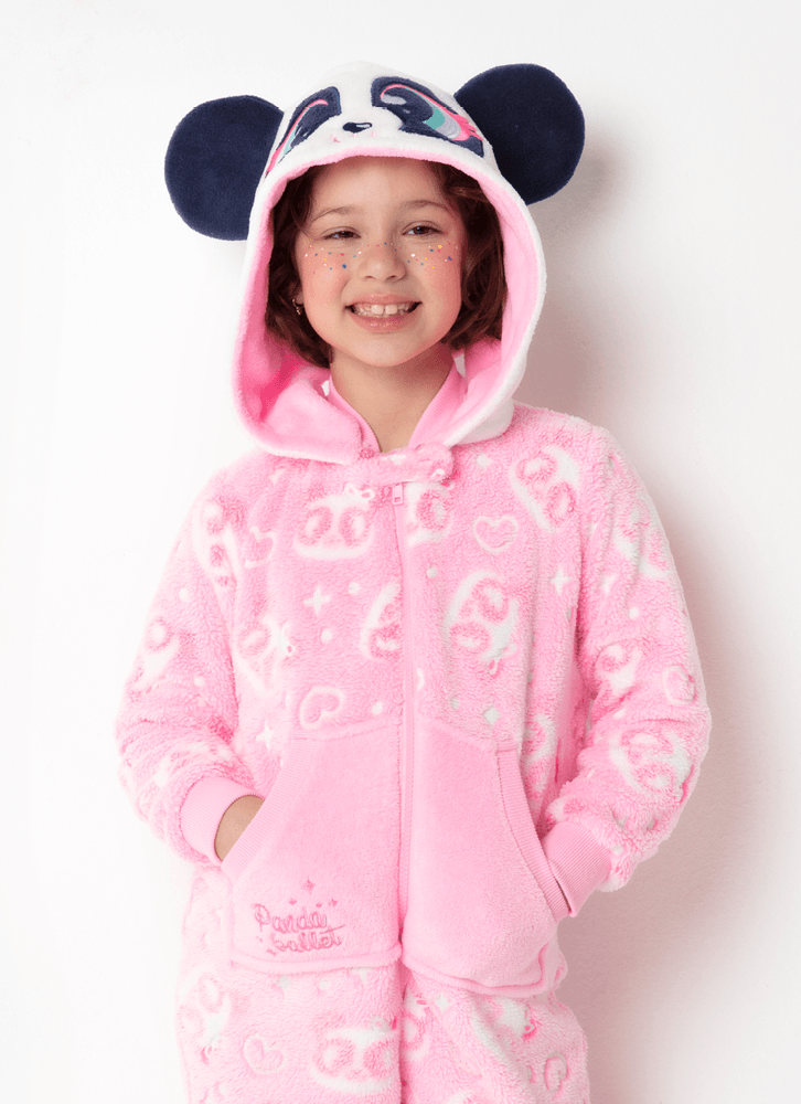 Macacão em coral fleece com estampa do panda Puket <3 Possui toque macio devido a sua característica felpuda o que torna o pijama super quentinho e confortável. Ideal para aconchegar noites frias. - Macacão todo em estampa corrida e fecho frontal em zíper; - Capuz bordado e com aplique 3D do rostinho do personagem; - Zíper com acabamento de segurança interno; - Punhos da manga e barra em ribana. Lavagem e conservação: Lavagem à mão; não alvejar; não secar em tambor; não passar; não limpar a seco (para mais informações, consulte a etiqueta fixada ao produto). Garantia: Deverá ser encaminhado dentro da embalagem original; sem indicações de uso; acompanhado de nota fiscal e com todos os Itens constante na solicitação da compra.