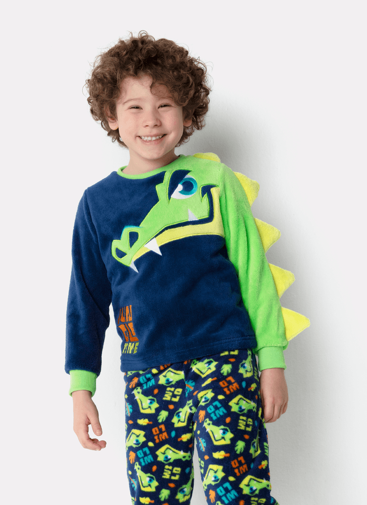 Pijama em coral fleece com estampa de jacare jungle Puket. Ideal para aconchegar noites frias. Possui toque macio devido a sua característica felpuda o que torna o pijama super quentinho e confortável, com aplique 3D do rostinho do personagem; Detalhes: Mangas longas com punhos em ribana; Gola redonda; Calça estampada com elástico macio na cintura; Calça modelagem reta com punhos em ribana; Lavagem e conservação: Lavagem à mão; não alvejar; não secar em tambor; não passar; não limpar a seco (para mais informações, consulte a etiqueta fixada ao produto). Garantia: Deverá ser encaminhado dentro da embalagem original; sem indicações de uso; acompanhado de nota fiscal e com todos os Itens constante na solicitação da compra.