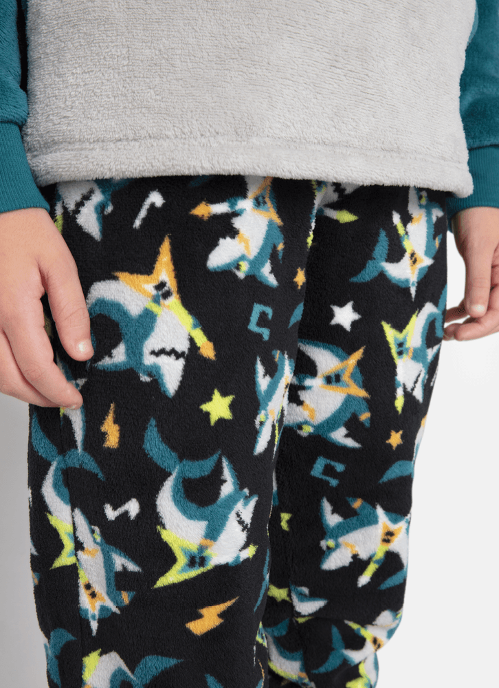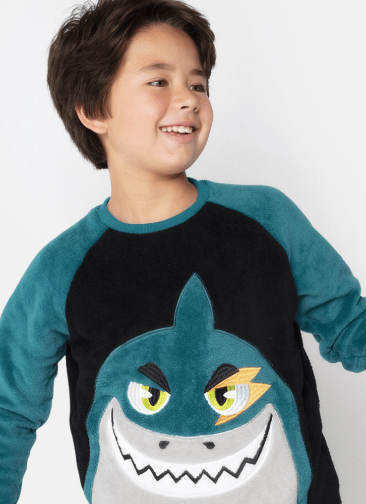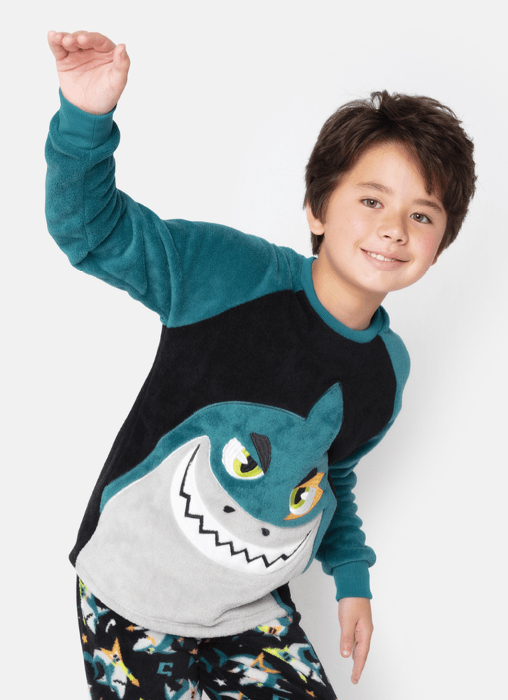 Pijama em coral fleece com estampa de tubarão Puket. Ideal para aconchegar noites frias. Possui toque macio devido a sua característica felpuda o que torna o pijama super quentinho e confortável, com aplique 3D do rostinho do personagem; Detalhes: - Mangas longas com punhos em ribana; - Gola redonda; - Calça estampada com elástico macio na cintura; - Calça modelagem reta com punhos em ribana; Lavagem e conservação: Lavagem à mão; não alvejar; não secar em tambor; não passar; não limpar a seco (para mais informações, consulte a etiqueta fixada ao produto). Garantia: Deverá ser encaminhado dentro da embalagem original; sem indicações de uso; acompanhado de nota fiscal e com todos os Itens constante na solicitação da compra.