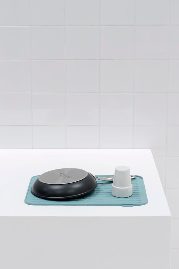 Feito em silicone macio e antiderrapante, o tapete escorredor é adequado para pratos, canecas e até mesmo para copos frágeis. A água do gotejamento da lavagem corre diretamente para a pia, ou seja, sua bancada permanece seca! Ficha técnica: • Código: 4081301115 • Marca: Brabantia • Conteúdo da Embalagem: 1 Tapete escorredor • Especificações do produto: Vai na lava-louças • Material: Silicone • Cor: Azul • Peso: 452g • Dimensões: 32,5cm x 43,8cm x 9cm (AxLxP) • Garantia: 3 Meses - Contra defeito de fabricação