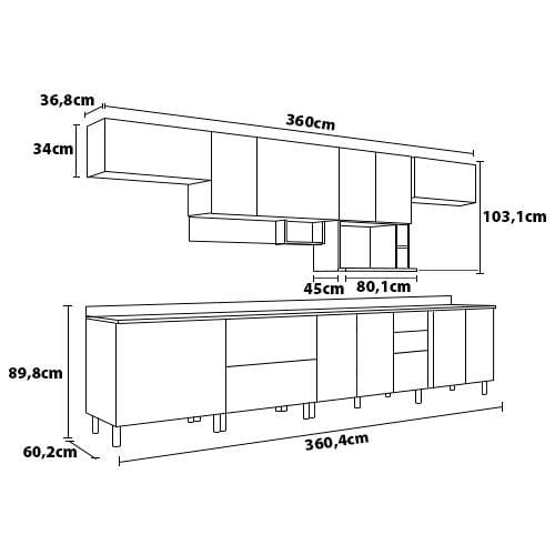 Conteúdo da Embalagem: - 1 Cozinha Completa Bartira Rubi com 10 Portas, 5 Gavetas e 6 Prateleiras - 360cm de largura