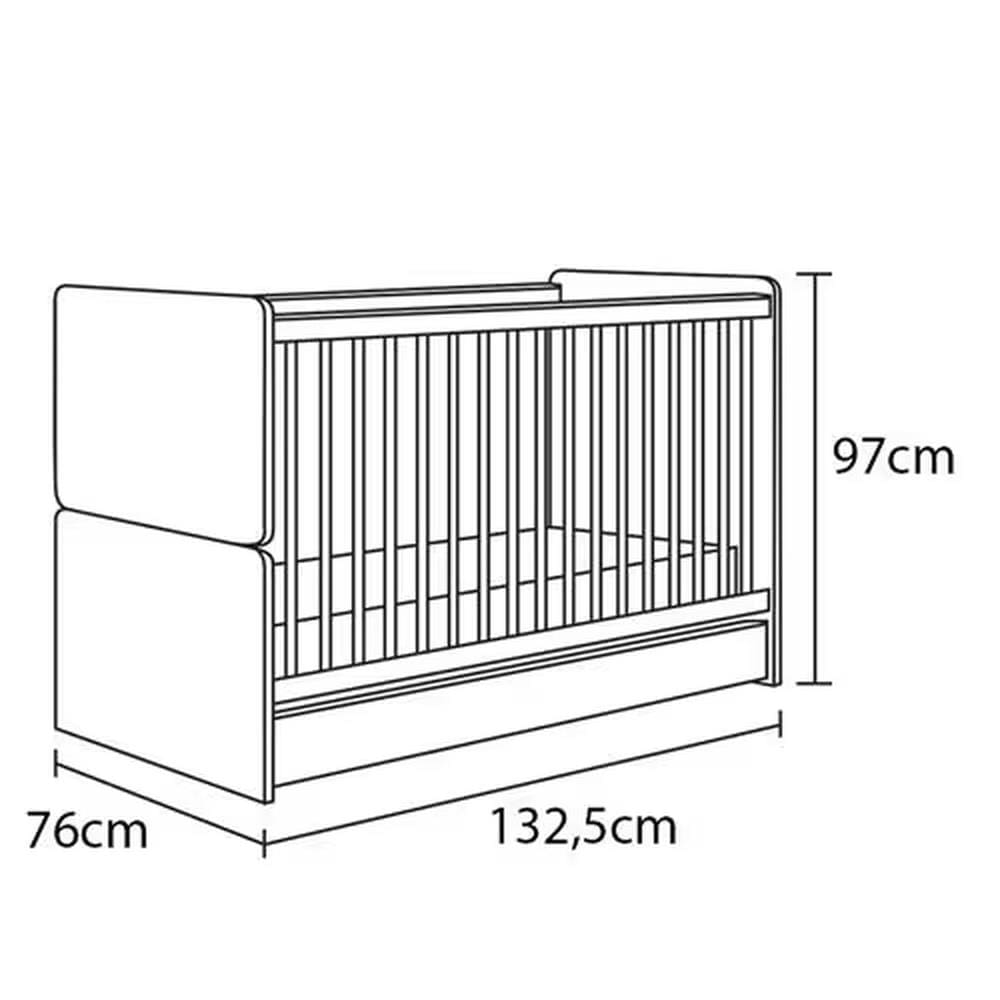 Características Gerais: - Berço Padrão americano - Material: MDF 12 e 25 mm - Base do colchão: madeira + MDF 6 mm - Acabamento: Pintura UV e PU atóxica - Bordas arredondadas - 3 opções de regulagem de altura - 4 rodízios (2 com trava) - Varal para mosquiteiro inclusoDimensões: 97 x 132,5 x 76 cm - Colchão Herval Baby Encanto Espuma - Material: Espuma de poliuretano - Densidade: D18 - Dimensões: 10 x 70 x 130 cm - Cor predominante: Branco estampado - Peso: 1,56 kg - Suporta até 30 kg - Indicado para crianças até 3 anos - Altura do colchão: até 12 cm