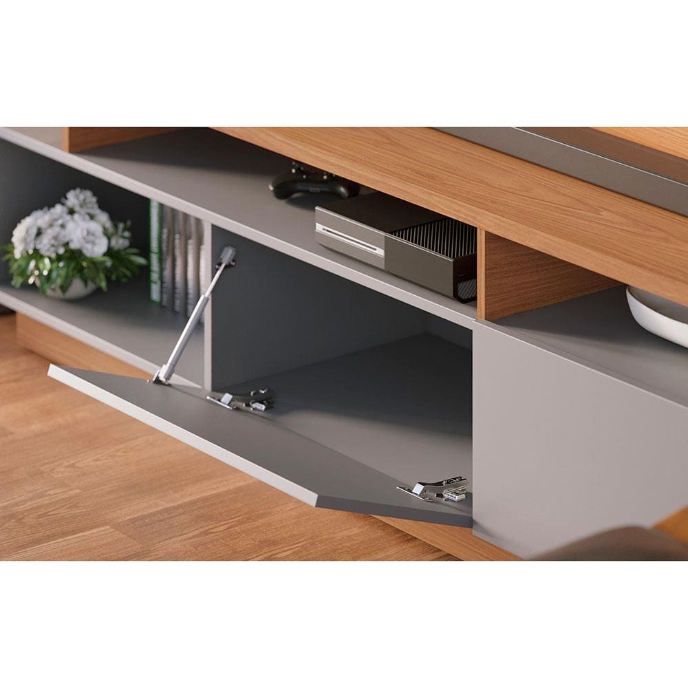 Contém também nichos internos e duas portas basculantes com pistão a gás ideais para armazenagem e organização de aparelhos eletrônicos e objetos decorativos.
