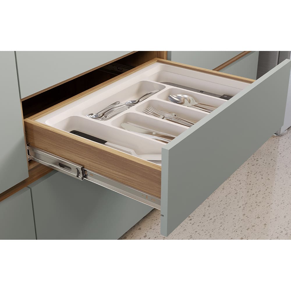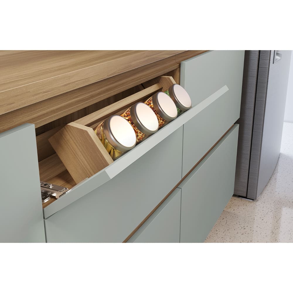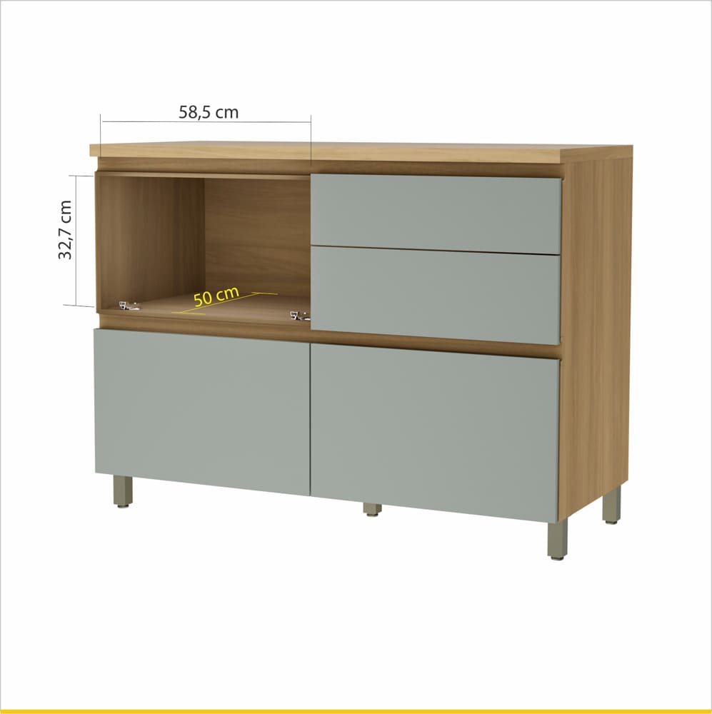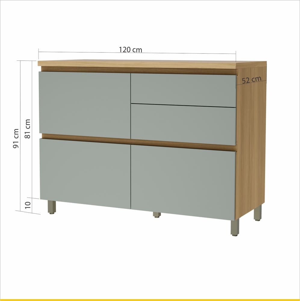 Com design exclusivo e puxador externo em alumínio, ele conta com ótimo espaço interno, tampo, porta de bater, prateleira resistente, gaveta com corrediça telescópica, organizador de talheres e dobradiças com freio anti-impacto slow motion. E mais, ele é compatível com pia de 120cm de largura (vendida separadamente) e possui acabamento em pintura UV possibilita maior durabilidade ao móvel.