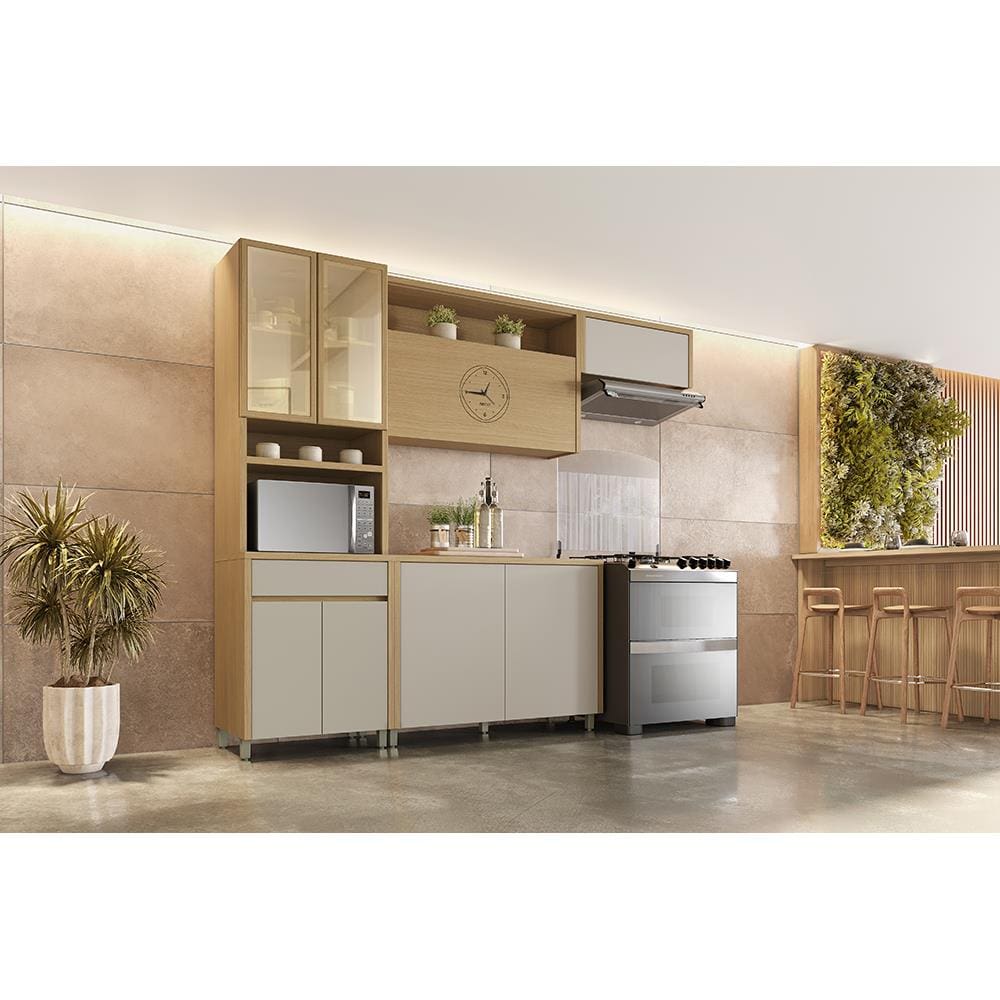 Com fundos em Duratree 3 mm anti-mofo e fita de borda 100% em polipropileno, o armário oferece resistência à umidade e maior vida útil. A impressão de alta qualidade nas caixas em padrão amadeirado carvalho confere sofisticação e durabilidade, fazendo deste móvel uma peça duradoura e charmosa para sua cozinha.