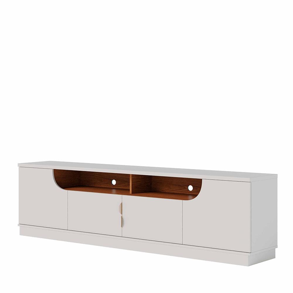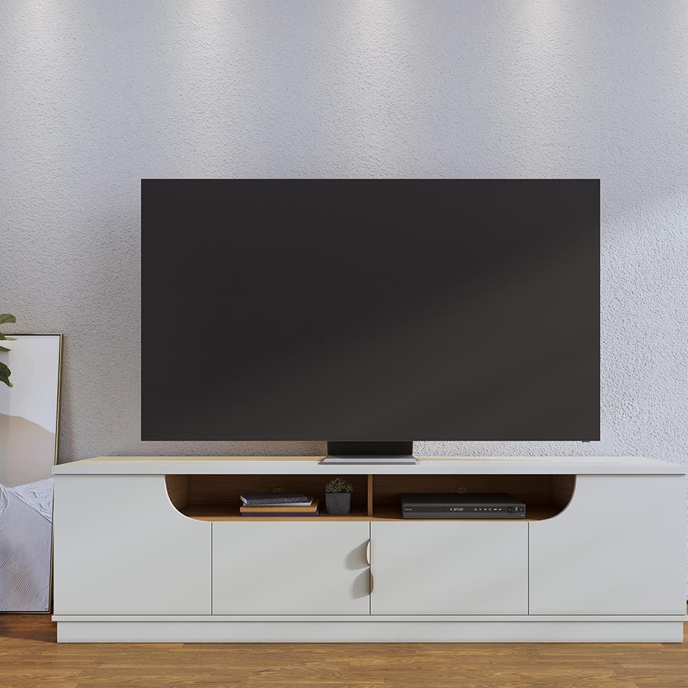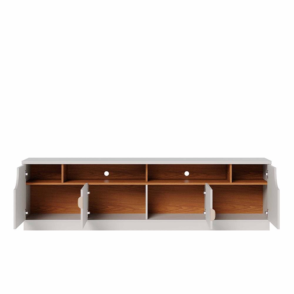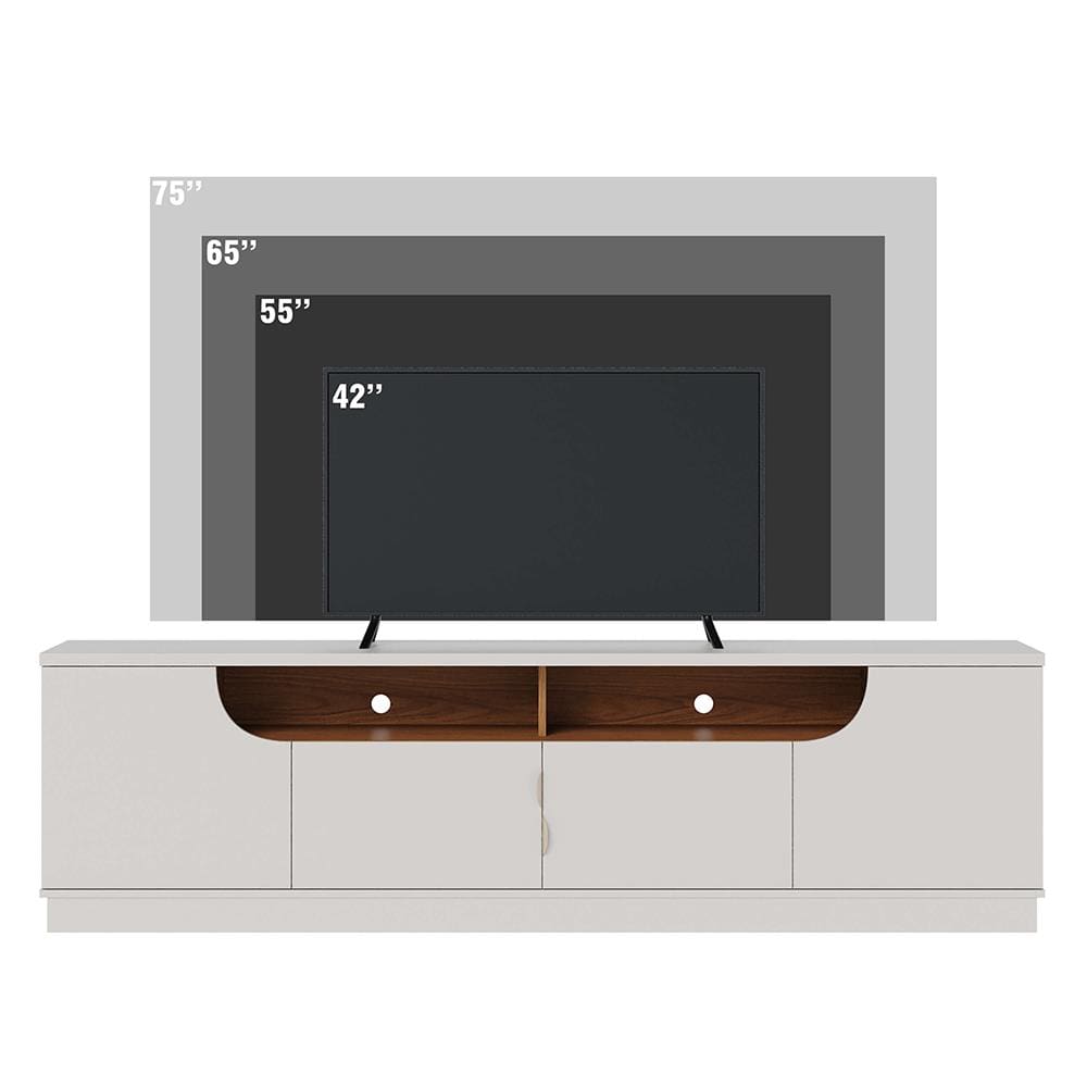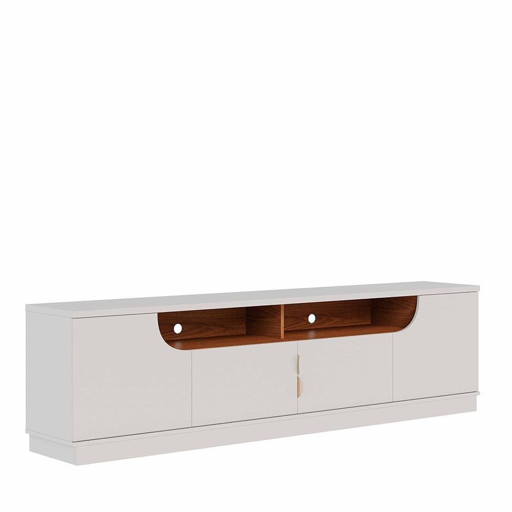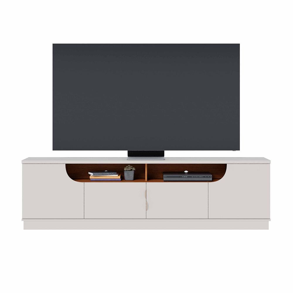 O tampo de 25mm garante robustez e suporta TVs de até 75 polegadas, com capacidade para até 30kg. Seu charme fica por conta das 04 portas de giro, sendo 02 com detalhe curvo, que trazem movimento e originalidade ao visual.