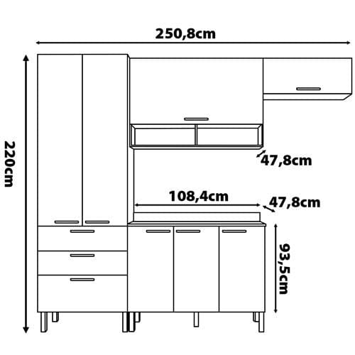 Conteúdo da Embalagem: -1 Cozinha Compacta Bartira Veneza com 7 Portas, 3 Gavetas e 5 Prateleiras - 250,8cm de largura.