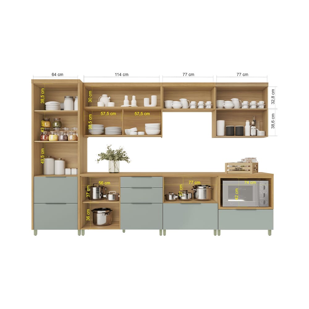 Conteúdo da Embalagem: - 1 Cozinha Completa Nesher Marquesa com 8 Portas e 7 Gavetas - 350cm de largura