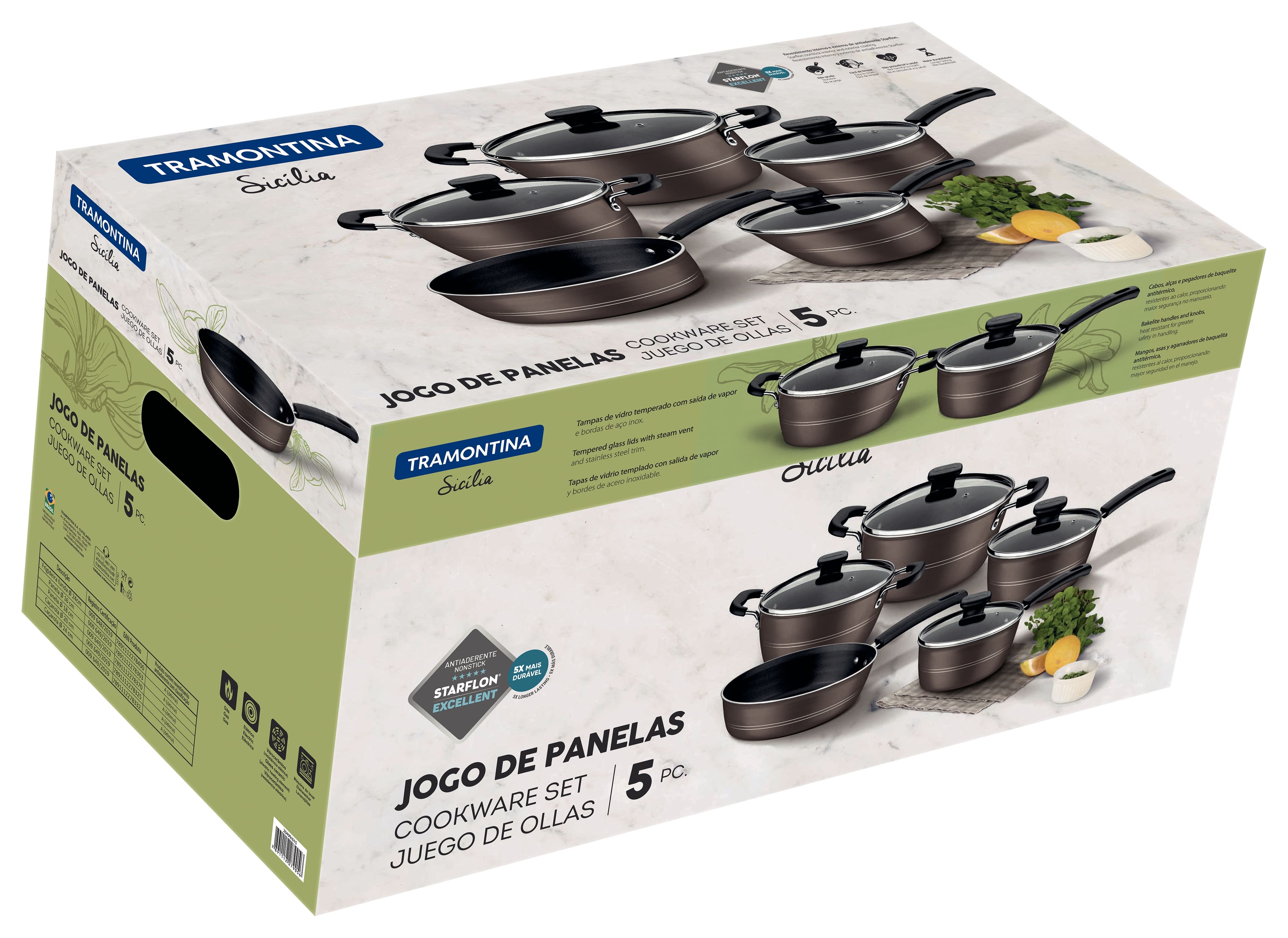 Beleza, funcionalidade e praticidade na sua cozinha com o Jogo de Panelas Tramontina Sicilia. Composto por 5 peças em alumínio com revestimento antiaderente Starflon Excellent, ele garante um cozimento uniforme e evita que os alimentos grudem, tornando o preparo das refeições muito mais eficiente.