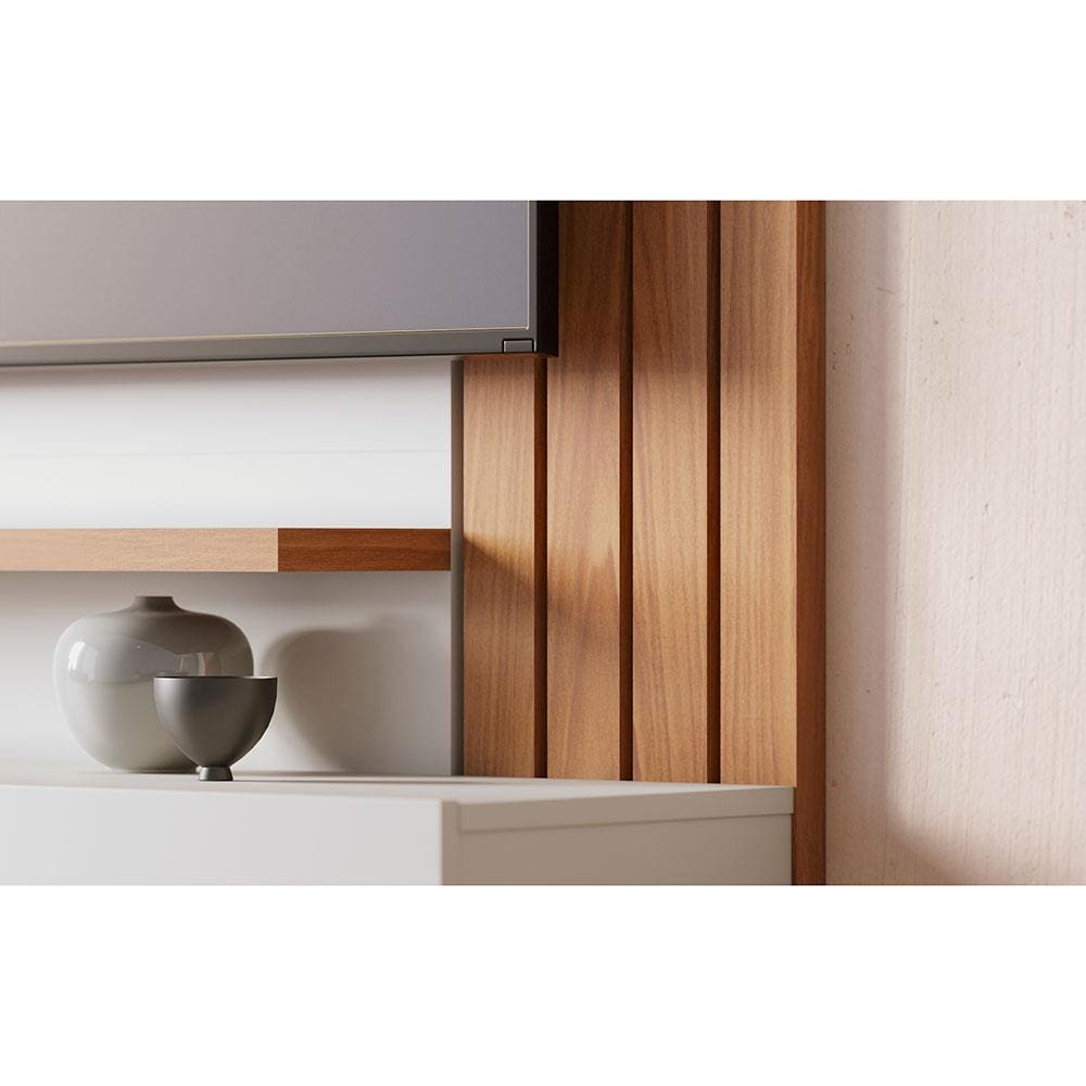 Com ripados decorativos em sua lateral, possui uma prateleira superior e outra inferior, além de duas portas basculantes com espaço interno para acomodar objetos de maneira prática e organizada, suporta TV’s de até 65 polegadas.