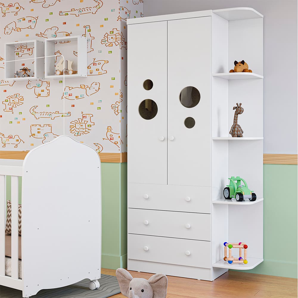 Além disso, o Guarda-Roupa Infantil Peroba possui quatro prateleiras externas, perfeitas para acomodar objetos de decoração e brinquedos, mantendo o ambiente sempre organizado e acolhedor.