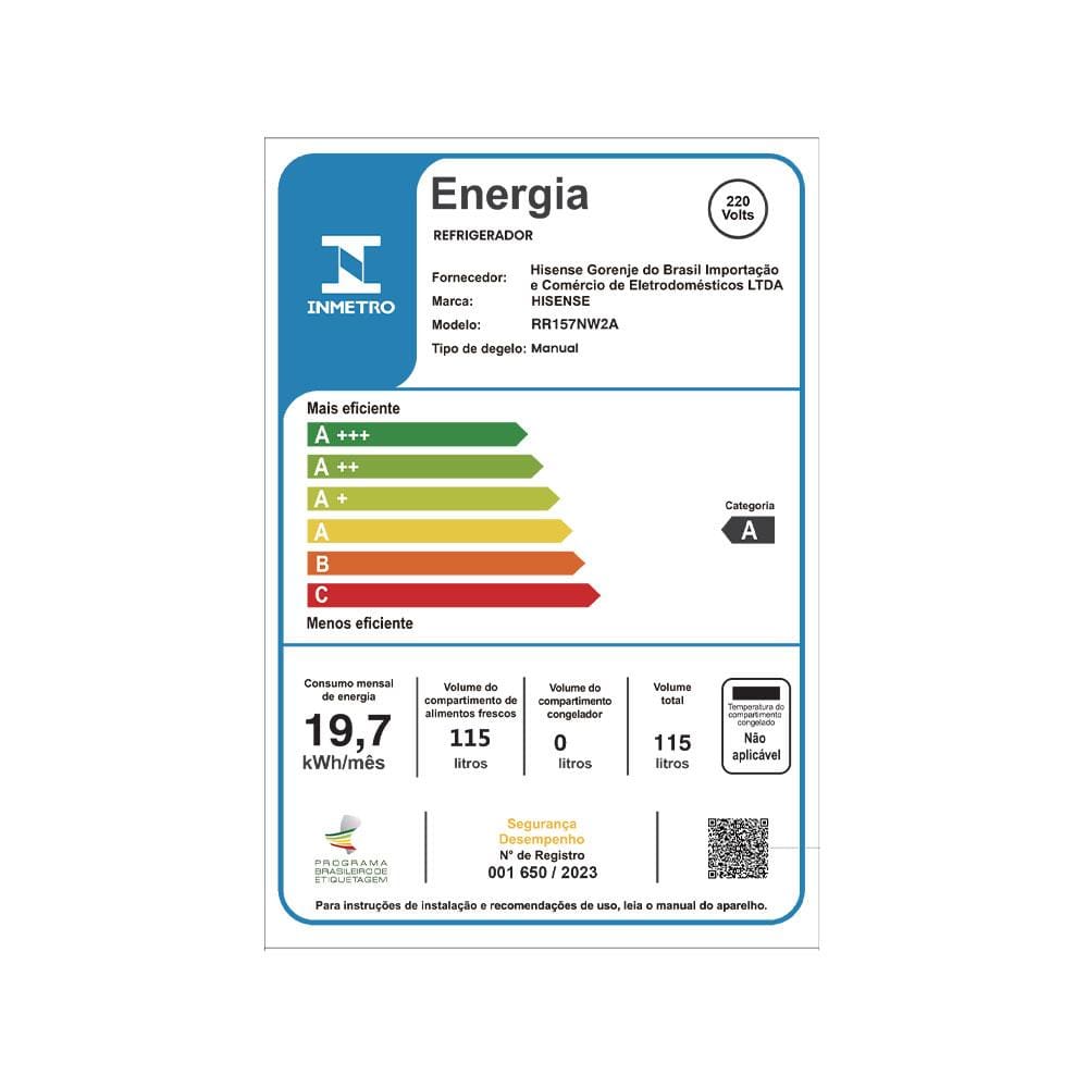 Conteúdo da embalagem: -1 Frigobar Hisense RR157NW com Porta Reversível e Termostato Ajustável 115L - Branco.