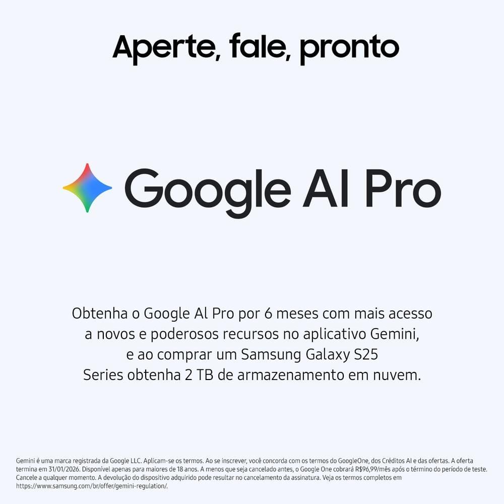 Smartphone Samsung Galaxy S25 FE 5G – Desempenho e design premium com excelente custo-benefício! O Smartphone Samsung Galaxy S25 FE 5G Azul-Marinho une desempenho avançado, inteligência artificial e design premium em um só aparelho. Com apenas 7,4 mm de espessura e 190 g, ele é leve, fino e sofisticado, oferecendo conforto no uso diário entregando o máximo de desempenho. Tela 6,7” A tela Dynamic AMOLED 6,7” FHD+ com até 120Hz e brilho máximo de 1900 nits oferece imagens nítidas e imersivas em qualquer situação. O acabamento em Gorilla Glass Victus+ aliado à proteção IP68 contra água e poeira garantem resistência e durabilidade. Processador Sinta toda a potência do processador Exynos 2400 Deca-Core 4nm, que garante performance estável para jogos, vídeos e multitarefas. Android 16 Sistema Operacional Android 16.0 com One UI 8.0, com até 7 versões de atualizações do Android. Armazenamento Armazenamento interno de 256GB e memória RAM de 8GB. Câmeras Possui sistema de Câmeras Triplas Traseira 50MP (Wide) + 12MP (Ultra Wide) + 8MP (Tele) com ProVisual Engine. Câmera frontal de 12MP com HDR proporcionam fotos e vídeos com qualidade profissional, mesmo em baixa luminosidade. Aproveite retratos, selfies e edições de vídeo com suporte de IA integrada. Galaxy AI O Galaxy AI com Google Gemini traz recursos de inteligência artificial para facilitar sua rotina, com integração nativa a aplicativos do Galaxy, Google e terceiros. O Samsung Knox protege seus dados pessoais com segurança avançada. Suporta eSIM Com eSIM integrado, o Galaxy S25 FE dispensa o uso do chip físico e permite ativar planos de celular de forma 100% digital. Além de praticidade e flexibilidade para alternar entre operadoras, o eSIM oferece mais segurança — já que não pode ser removido em casos de perda ou roubo — e garante maior estabilidade de conexão. Bateria Além de performance e design, o Galaxy S25 FE conta com bateria de 4.900mAh, atualizações garantidas de até 7 anos de segurança, garantindo longevidade e confiabilidade para o seu aparelho.