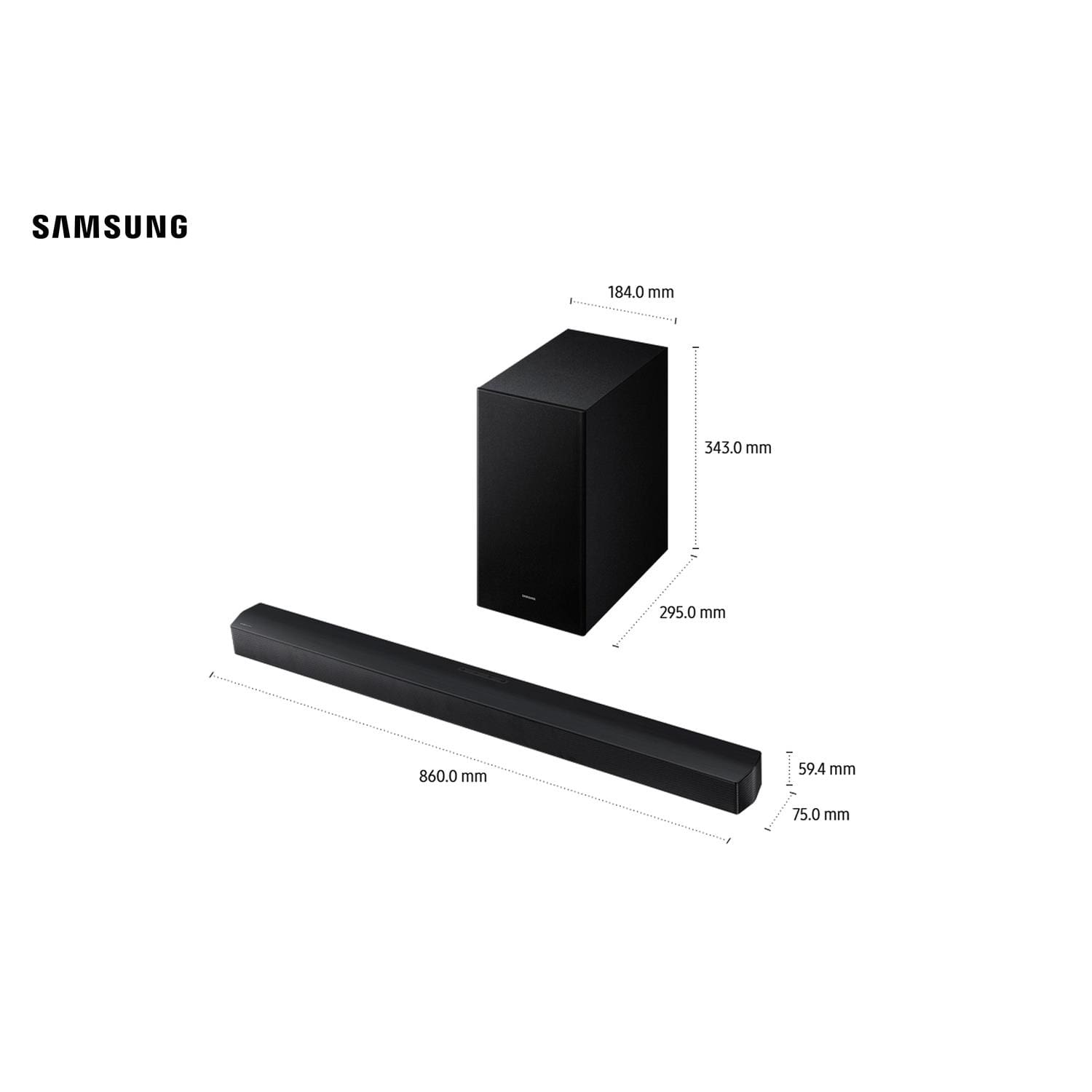 - Dimensões subwoofer (LxAxP): 184 x 343 x 295 mm