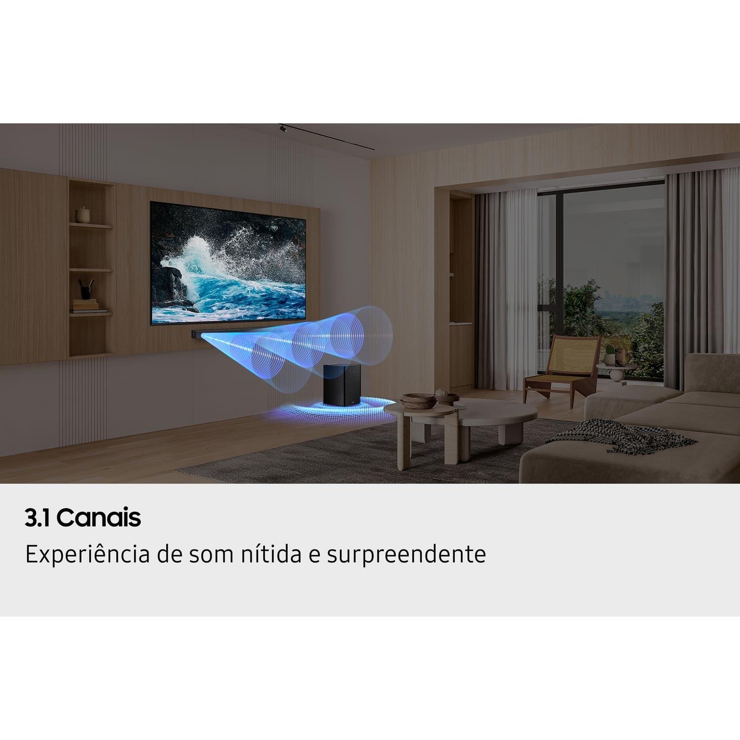 A função Q-Symphony sincroniza a TV e a soundbar para trabalharem em perfeita harmonia, proporcionando um som integrado e equilibrado. Além disso, o Som Adaptável ajusta automaticamente o áudio conforme o conteúdo, enquanto o Modo Jogo intensifica os efeitos sonoros para uma experiência imersiva.
