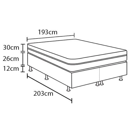 Características Gerais: Colchão - Molejo com molas ensacadas individualmente e 170 molas por m² - Camada Pillow Euro - Densidade D28 - Tratamento antiácaro, antialérgico, antibactéria, antifungo e antimofo - Suporta até 110kg por pessoa - Medidas: 30 x 193 x 203cm (AxLxP) Base - Revestimento em tecido Poliéster - Pés rosqueavéis - Feito em eucalipto - Medidas: 26 x 193 x 203 cm (AxLxP) - Bipartida: composta por duas bases de 96 cm de largura
