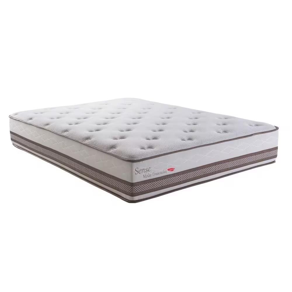 O colchão Herval Sense conta com estrutura de molas ensacadas tipo DSS, fabricadas com fio de aço especial de 2,0 mm, que absorvem os movimentos do corpo e reduzem a transferência de impactos. Possui camadas de espumas de diferentes densidades e feltro resinado, garantindo maior firmeza e suporte ao deitar.