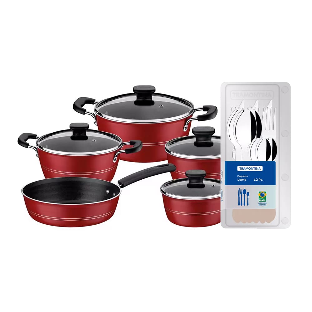 Conjunto de Panelas Tramontina Sicilia com Revestimento Starflon Excellent Vermelho – 5 Peças + Faqueiro 12 Peças Tramontina Leme - Cinza