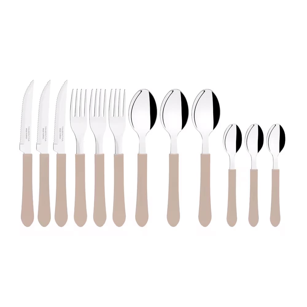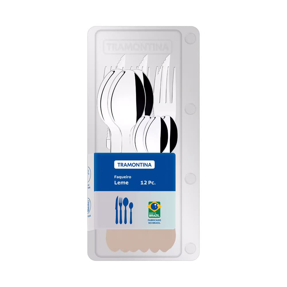O Faqueiro 12 peças Tramontina Leme com lâminas em aço inox e cabos de polipropileno na cor cinza é a escolha perfeita para quem deseja compor uma mesa elegante, moderna e funcional. Ideal para o dia a dia, suas peças combinam resistência e durabilidade: as facas têm excelente fio de corte graças ao tratamento térmico, e os garfos e colheres são reforçados pela espessura e estampagem das lâminas. Composto por facas para churrasco, garfos, colheres de mesa e de chá, o jogo pode ser levado à máquina de lavar louças, proporcionando mais praticidade e estilo à sua rotina.